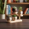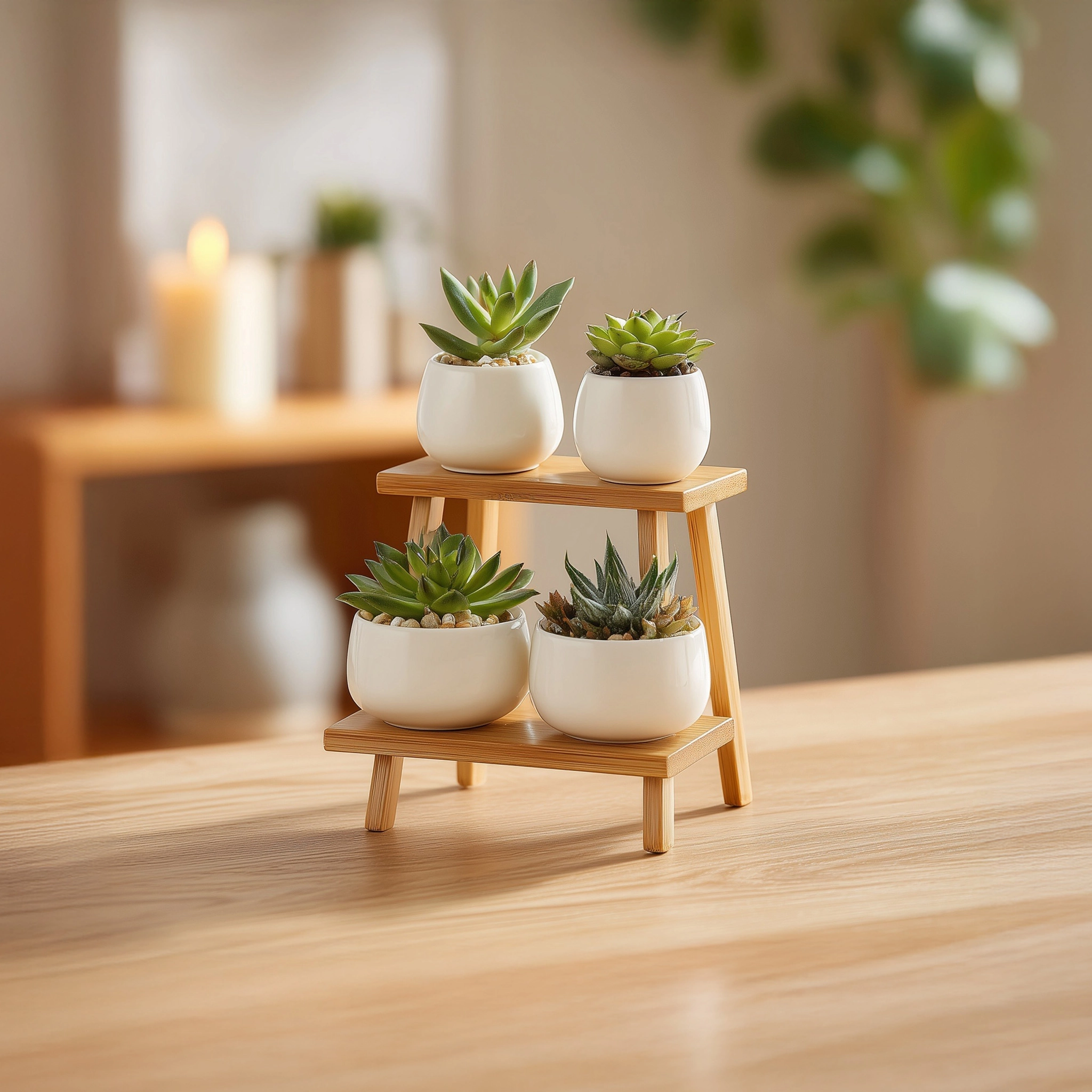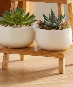This compact two-tier wooden desktop display stand features a stepped layout that elevates items at different heights, creating a clean and organized presentation. The lightweight structure helps maximize surface space while maintaining a stable and balanced arrangement.