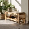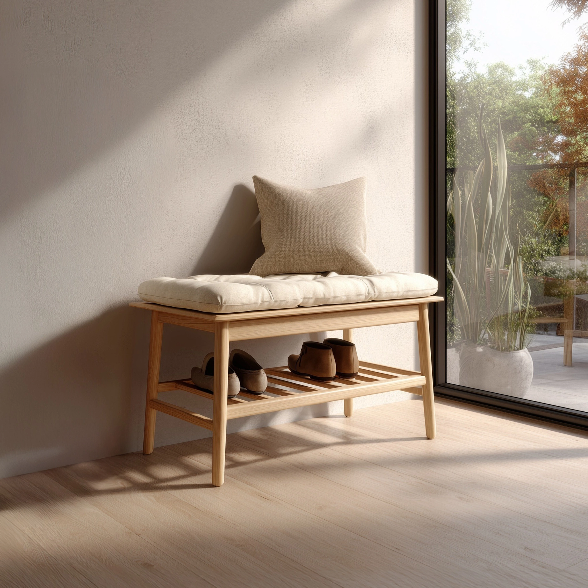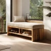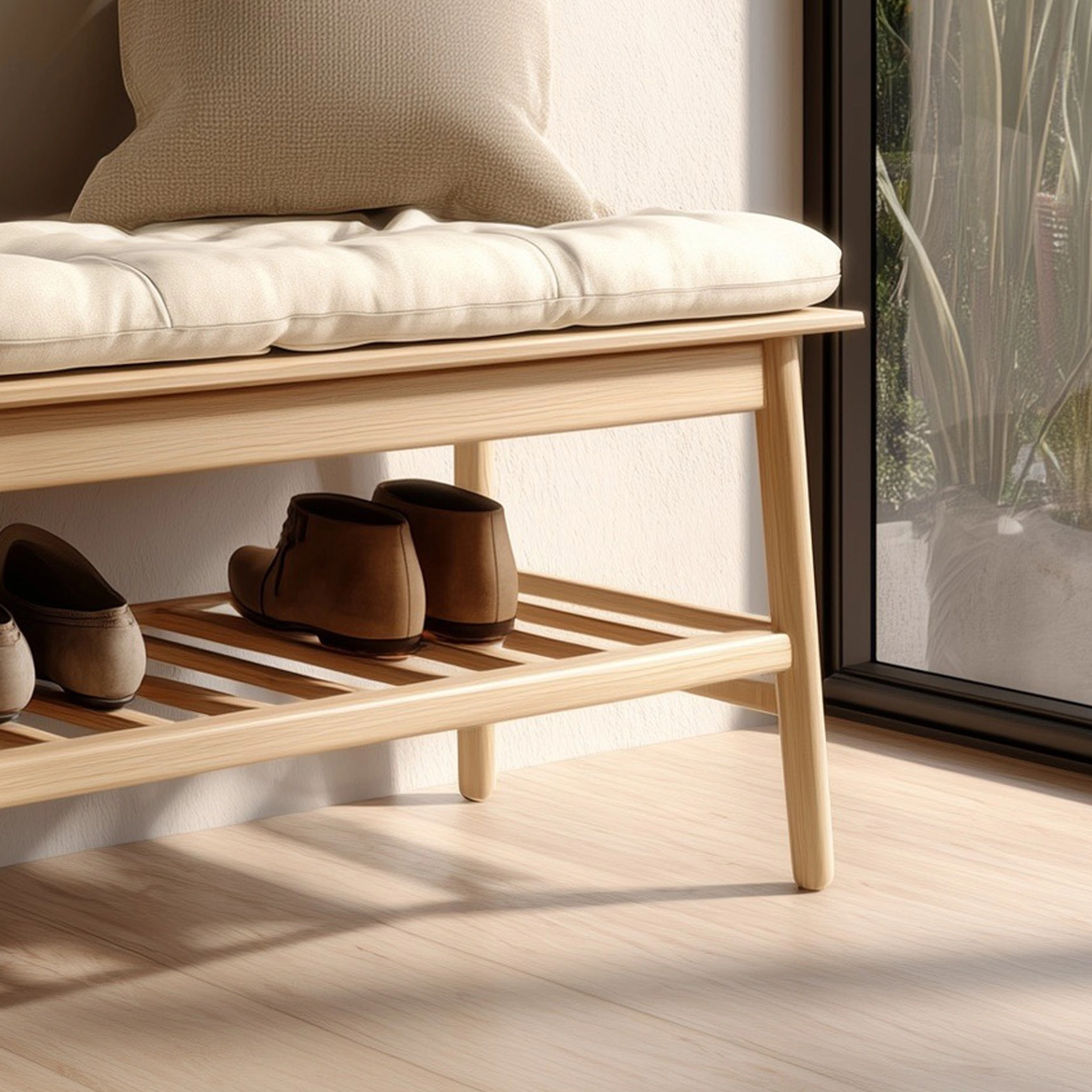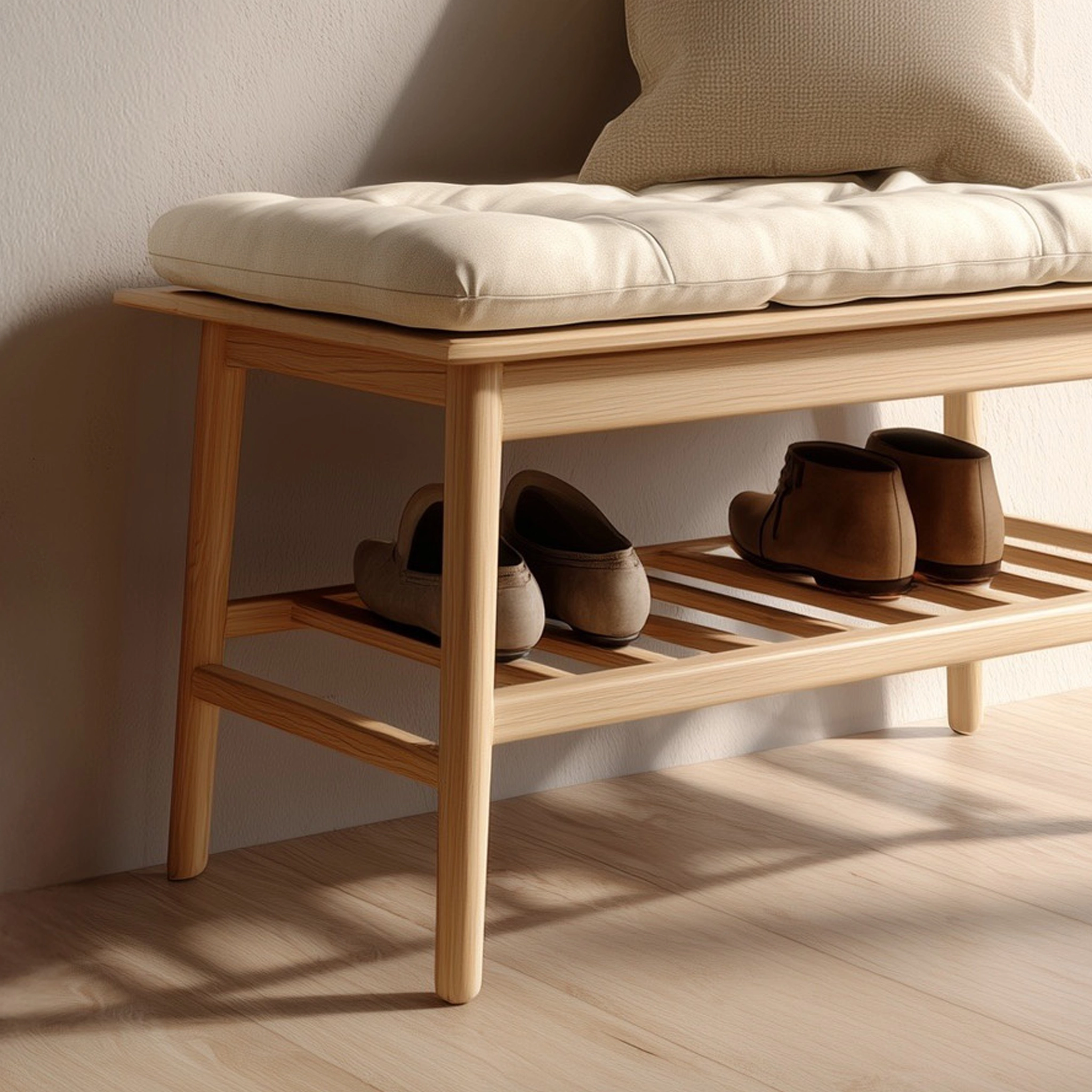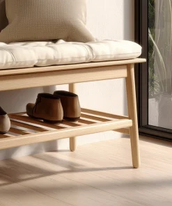 An open slatted shelf beneath the seat allows shoes or small items to be stored neatly and remain easily accessible. With its restrained form and natural material presence, this bench integrates well into entryways, bedrooms, or quiet transition spaces without overwhelming the interior.