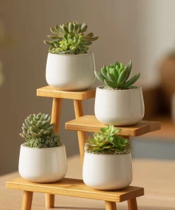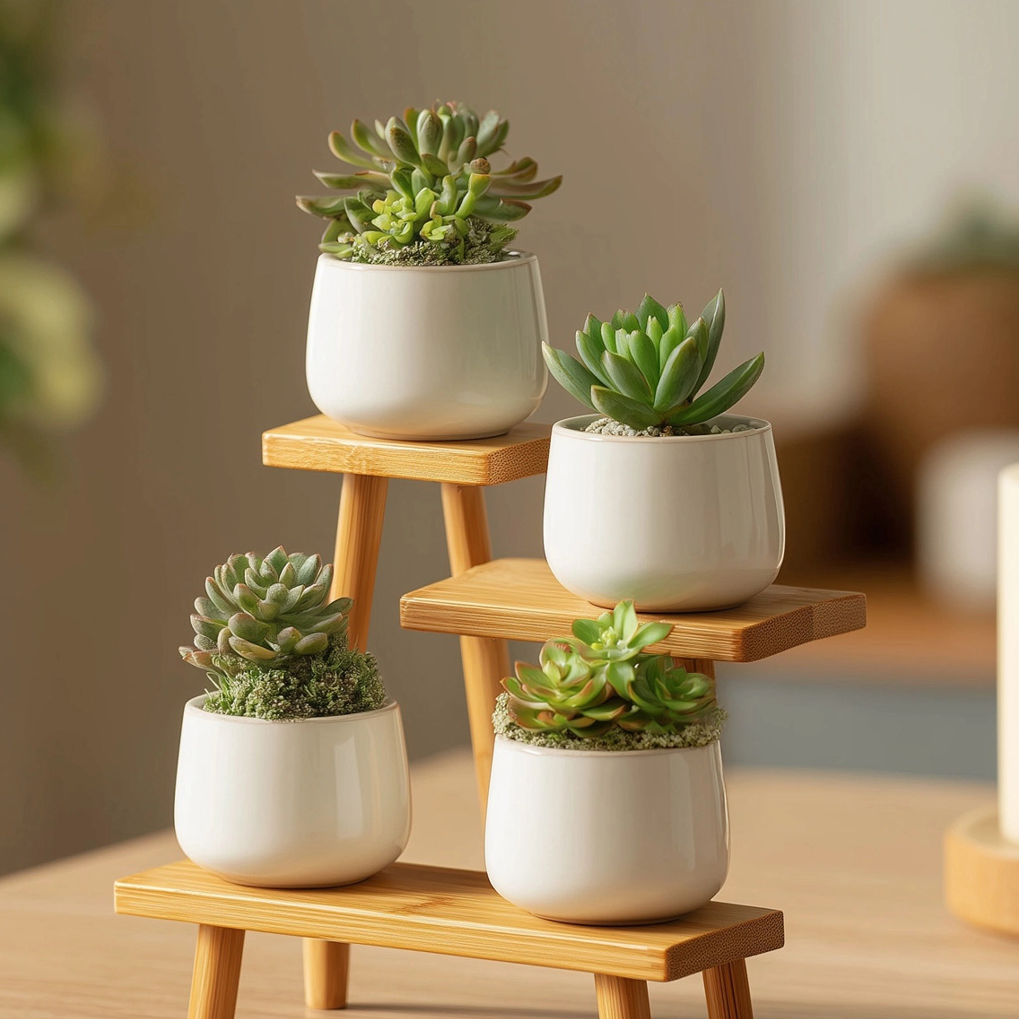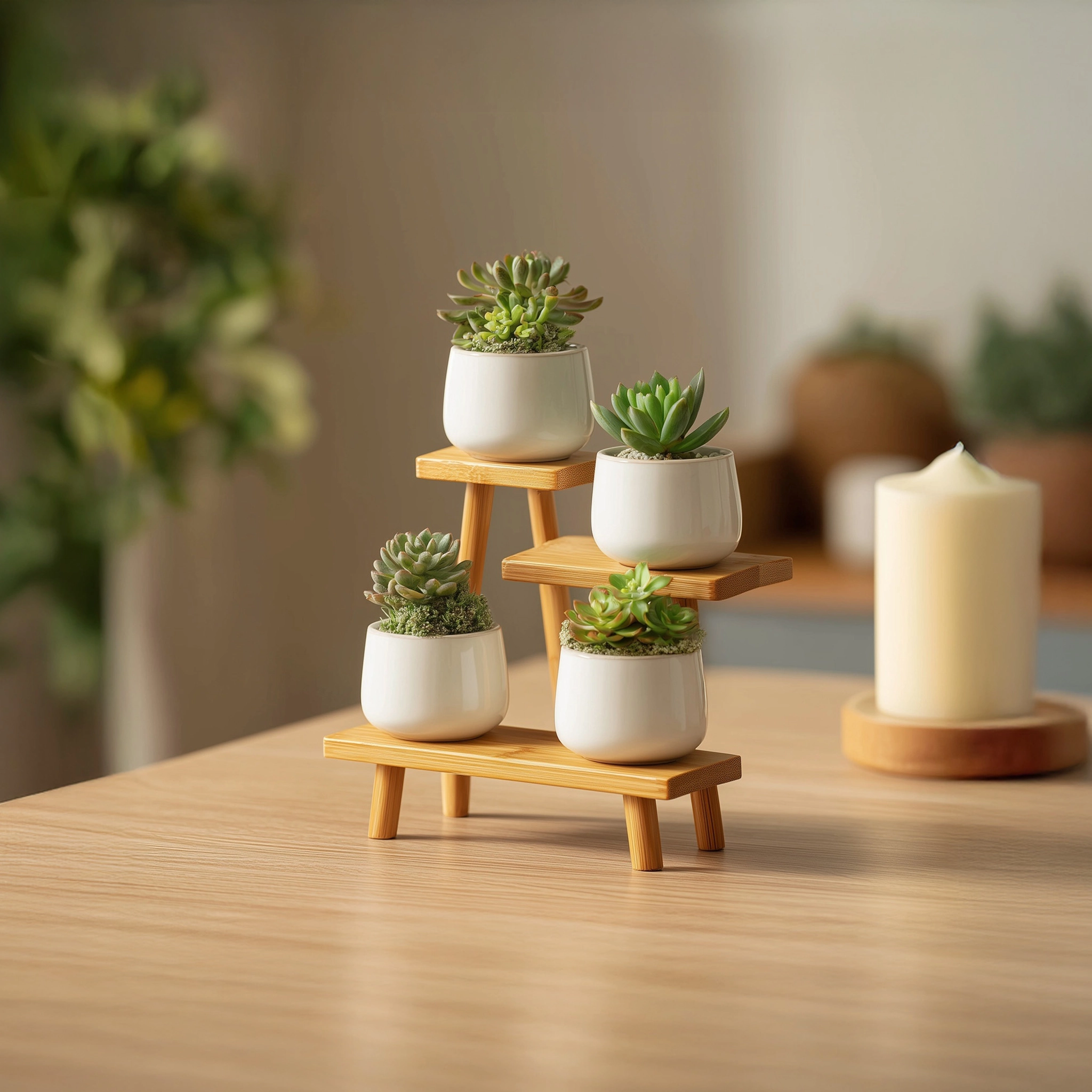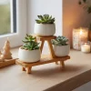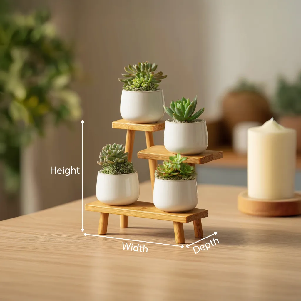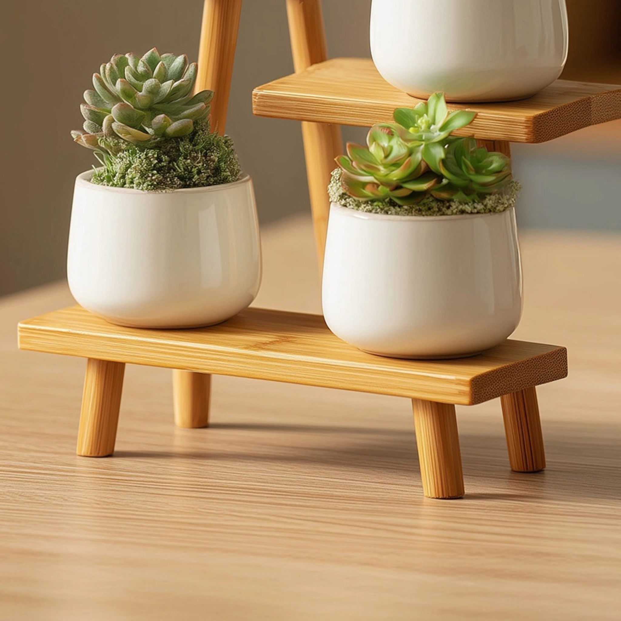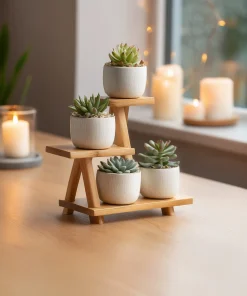 This compact wooden tiered table display stand features a multi-level structure that helps separate and highlight small objects with clarity. The staggered platforms create visual depth while maintaining a neat, space-efficient footprint suitable for desks, shelves, or countertops.