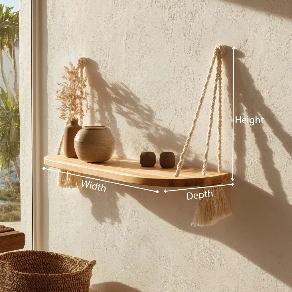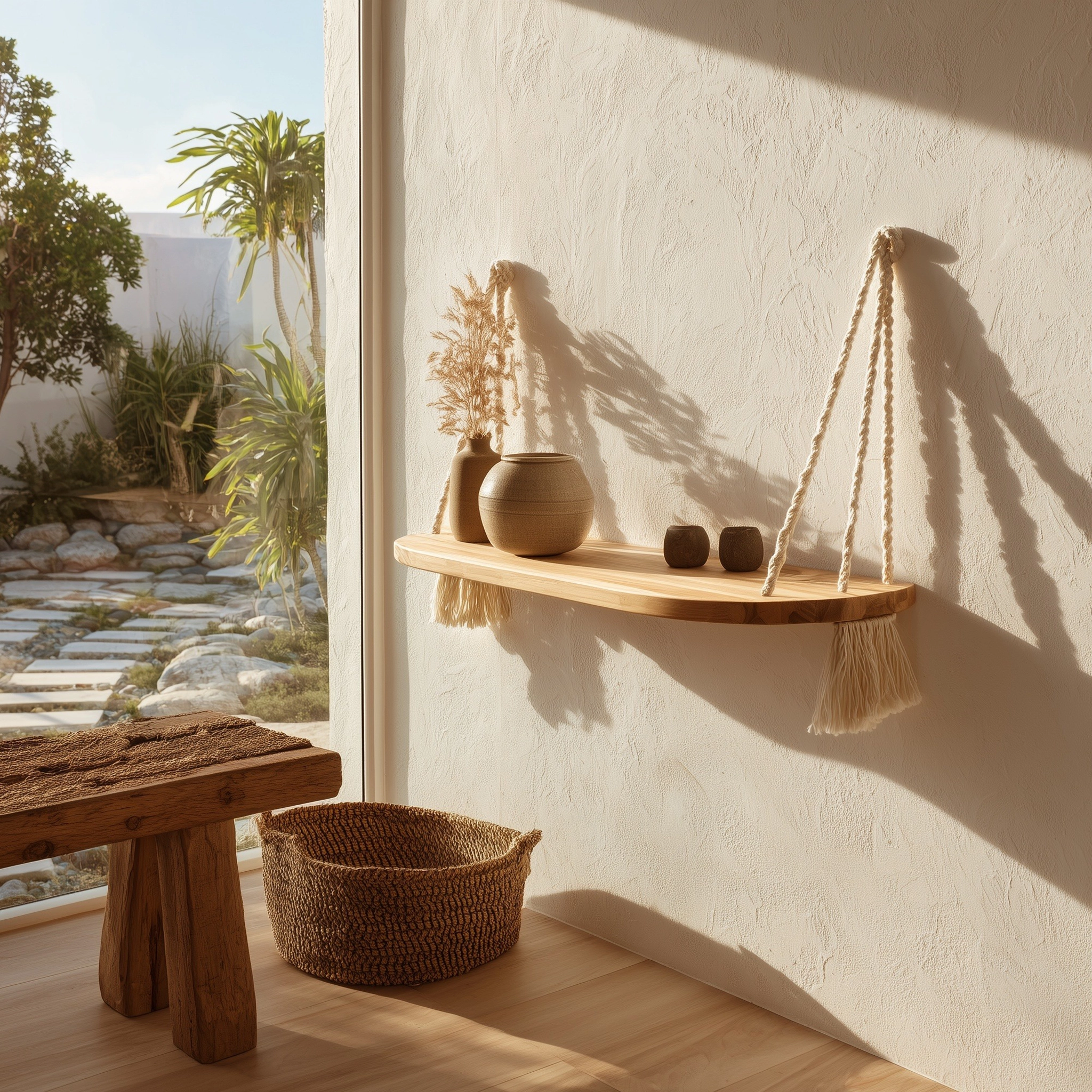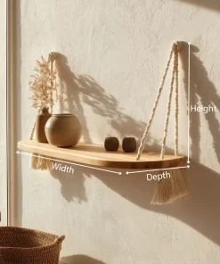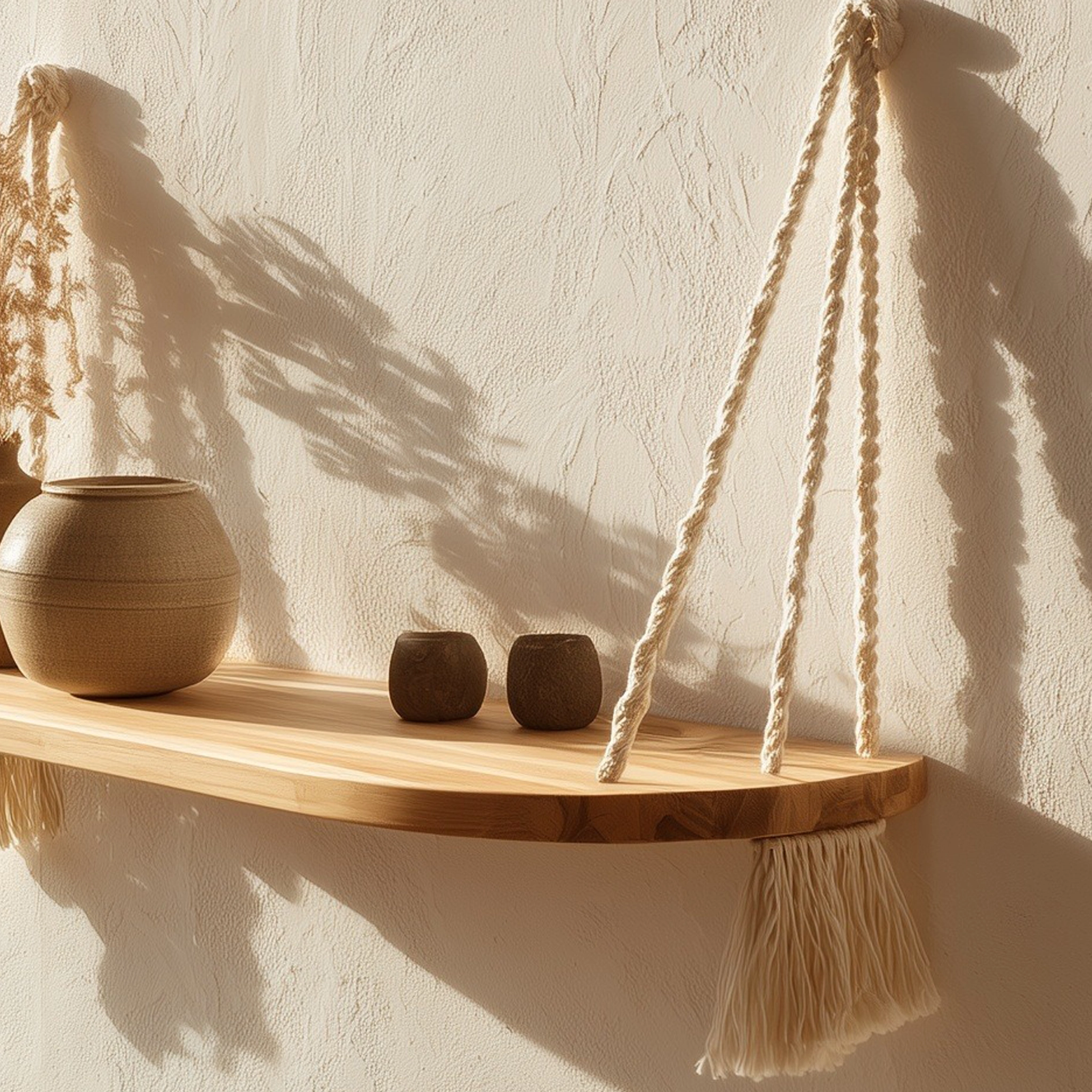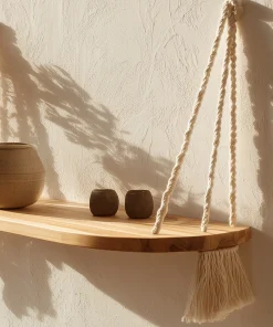 This hanging shelf features a gently curved wooden surface paired with knotted rope supports, creating a balanced composition of structure and softness. The rounded edges and visible rope details bring a warm, handcrafted character that complements light-filled interiors.