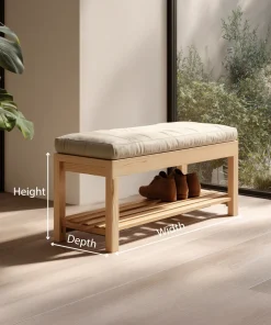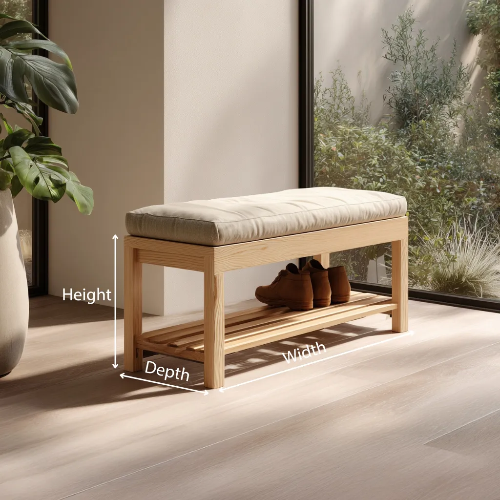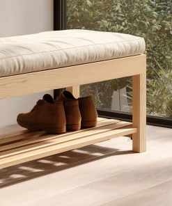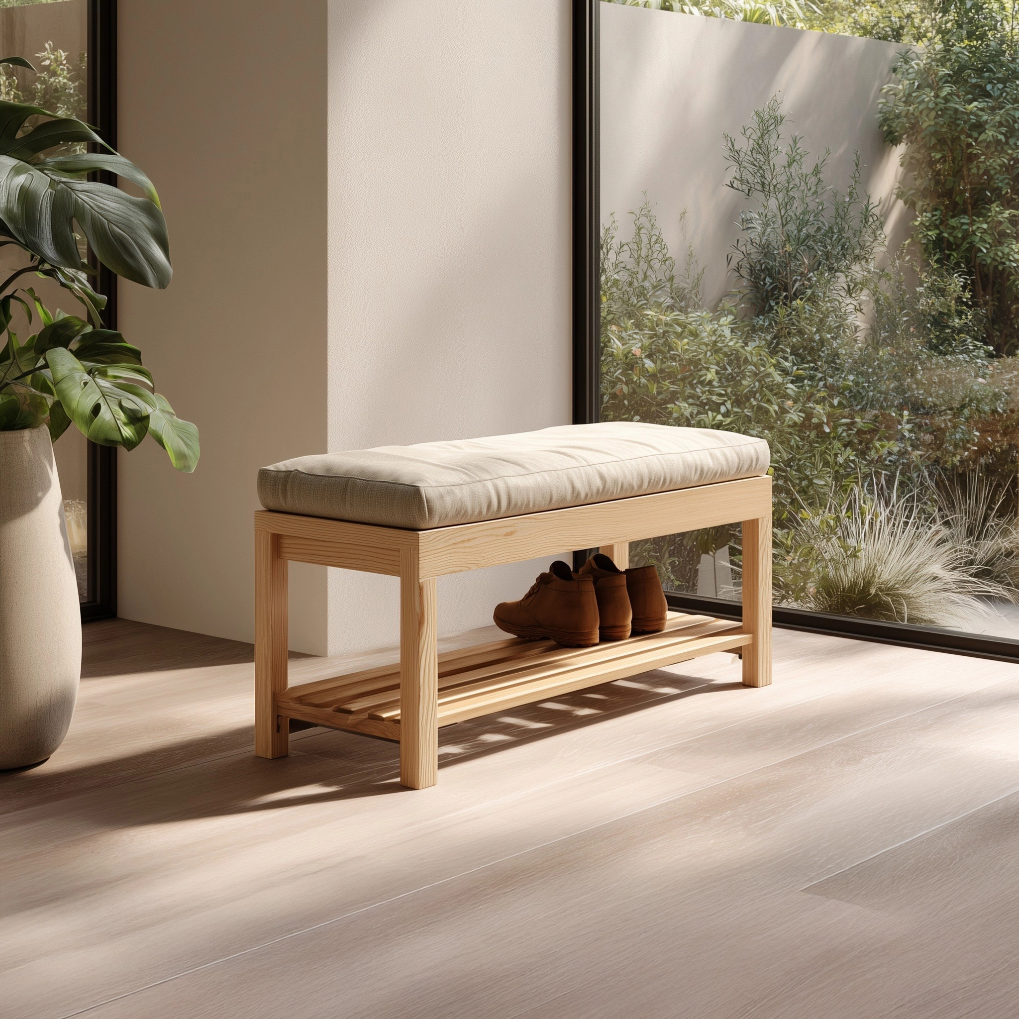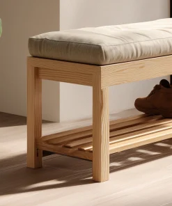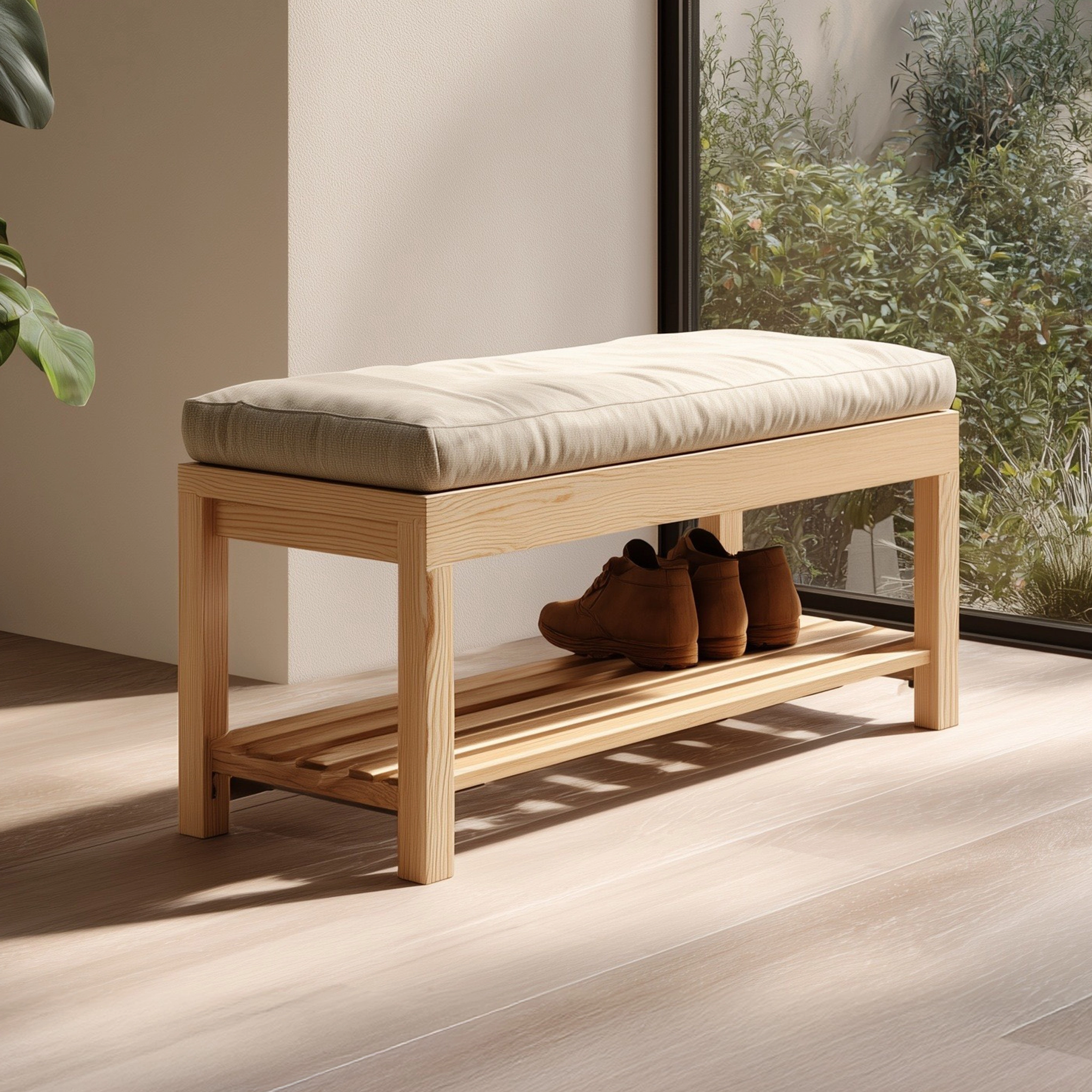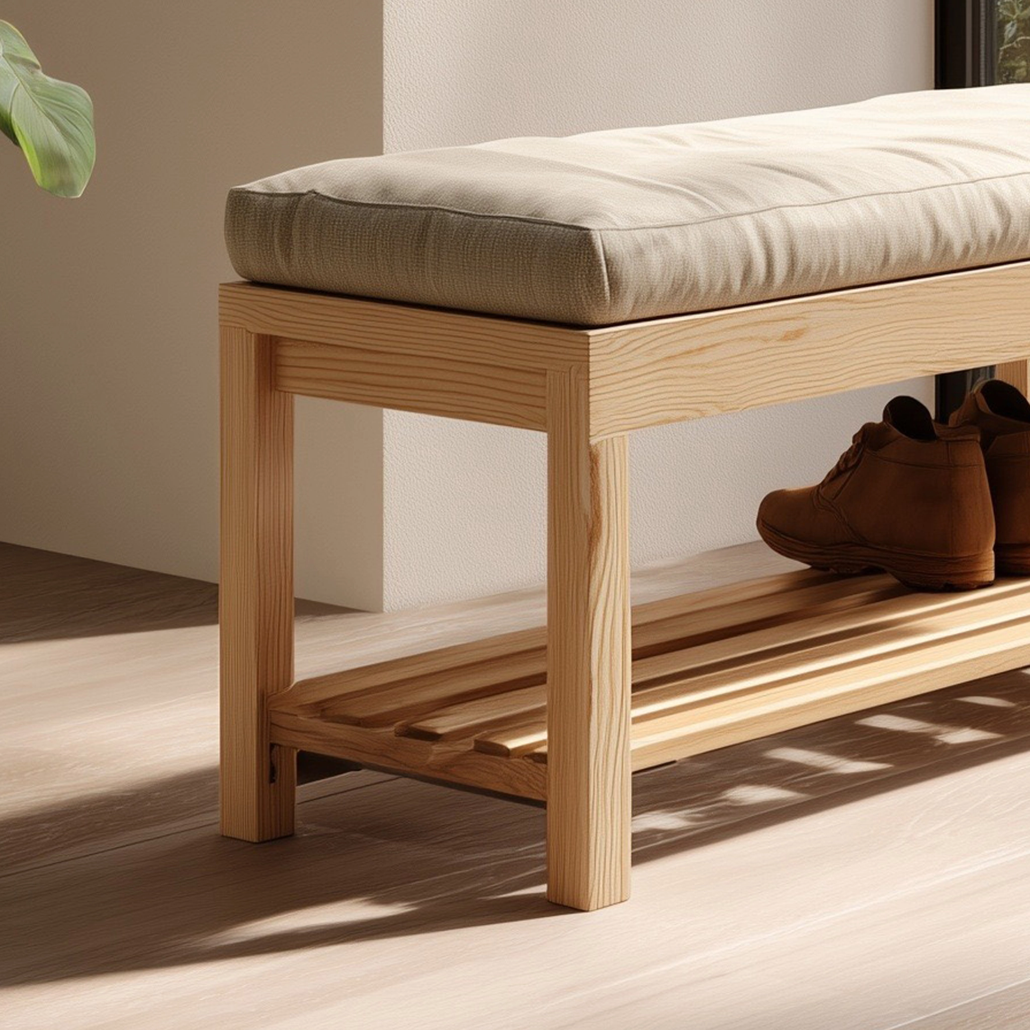 A light wood entryway bench defined by clean lines and balanced proportions, designed to sit comfortably within modern or minimalist interiors. The open lower shelf provides practical space for shoes or daily essentials while maintaining a calm, uncluttered look.