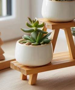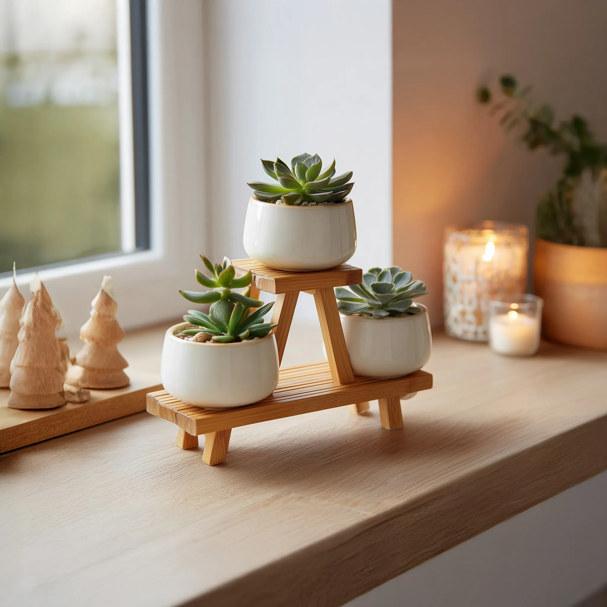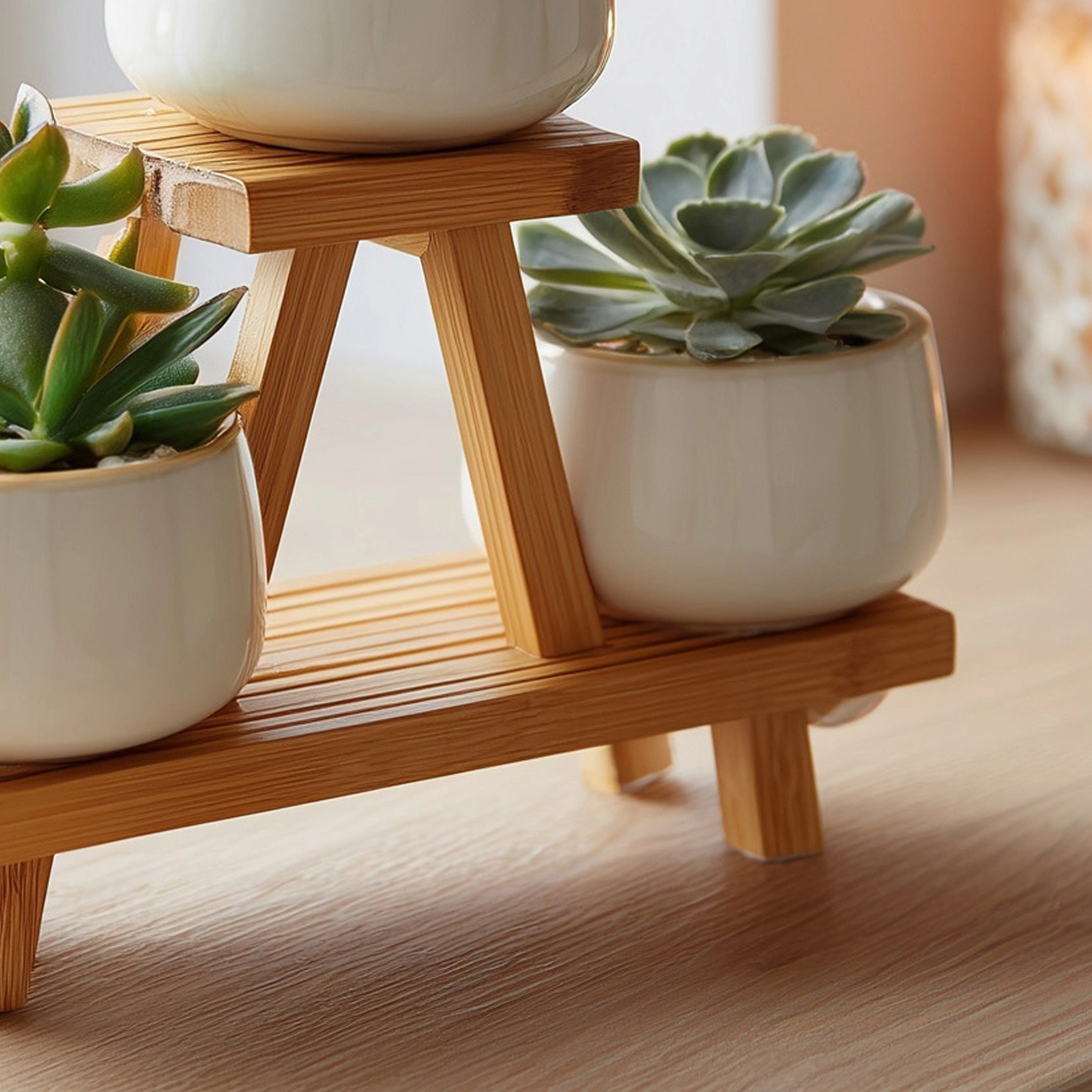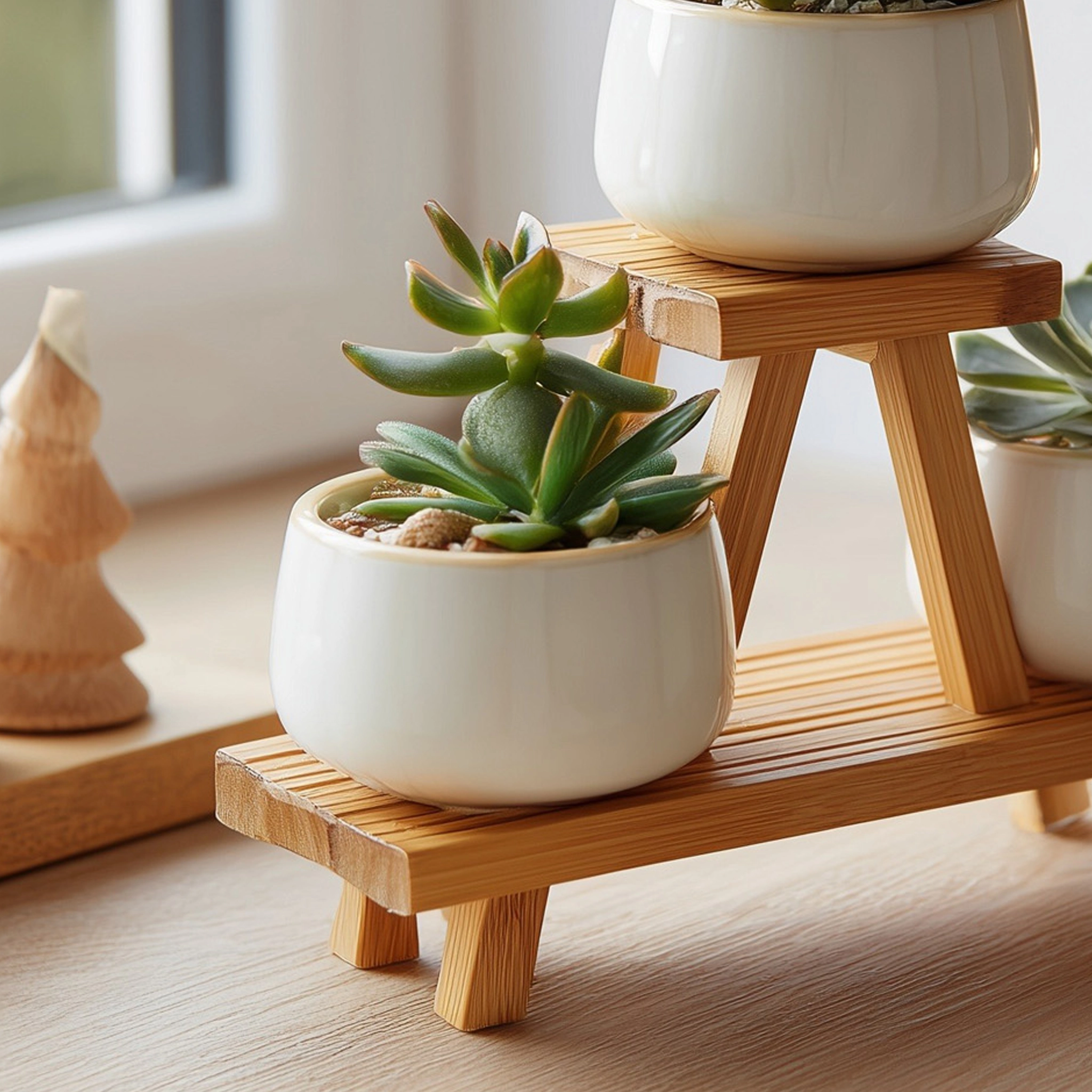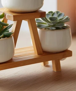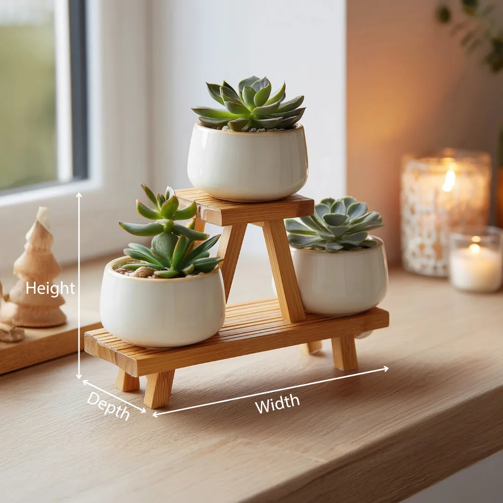 This mini wooden step display stand features a simple two-level structure that helps create height variation and visual interest for small decorative objects. Its compact footprint makes it suitable for window sills, shelves, desks, or side tables where space is limited but thoughtful styling is desired.