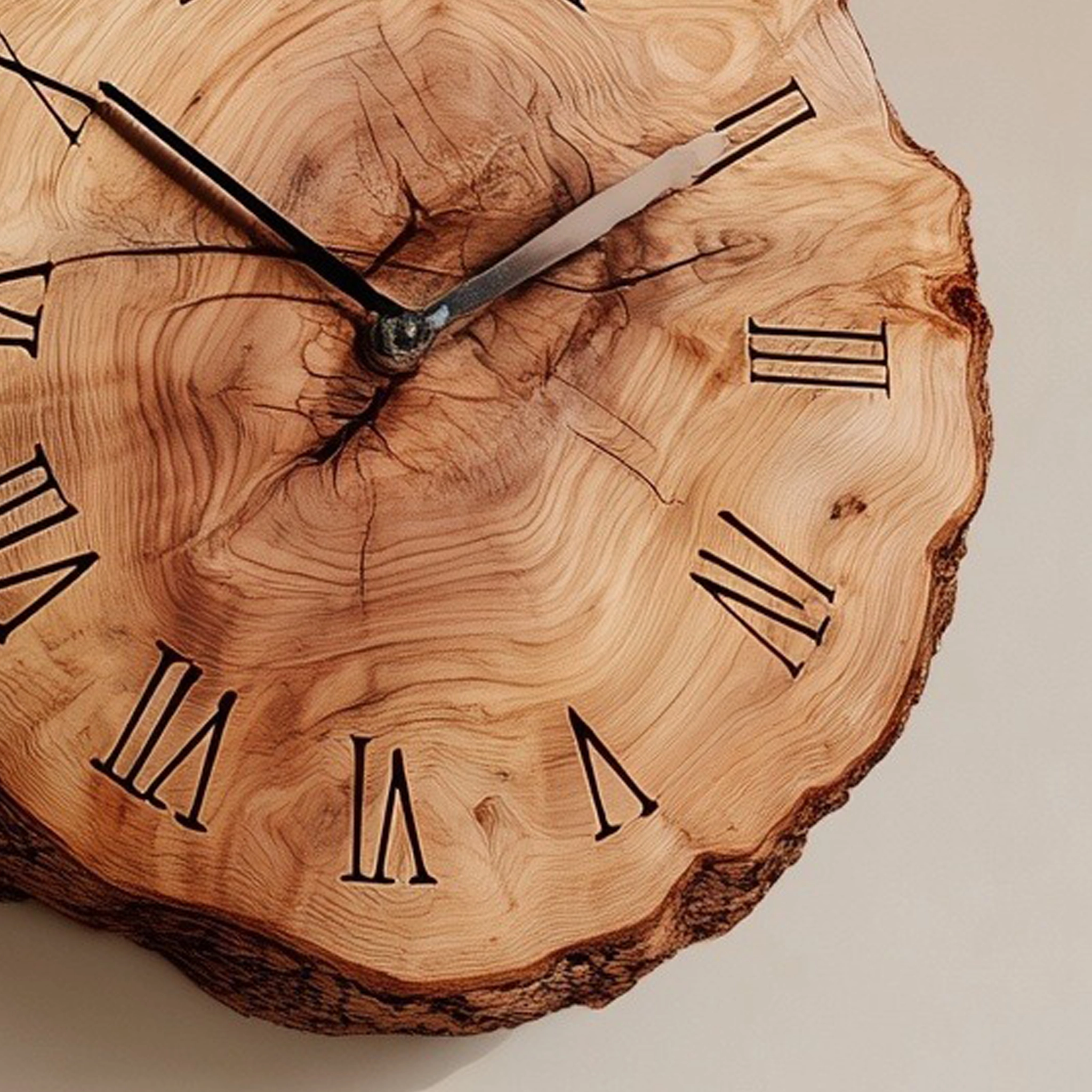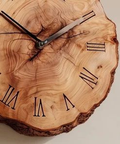 A round wall clock featuring an organic wood slice shape with visible grain patterns and Roman numeral markers.