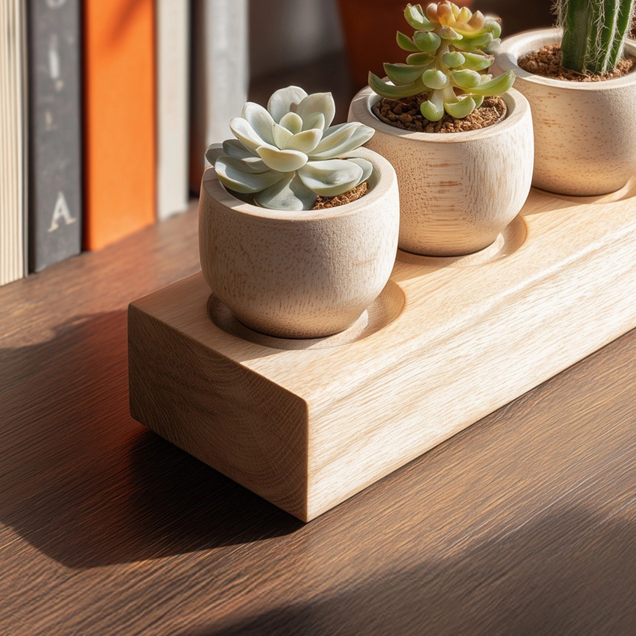 A rectangular wooden display block designed to hold and organize three small decorative items in a clean linear layout.