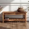 An open shelf beneath the seat offers space for shoes, baskets, or small household items, helping keep entry areas organized. With its restrained structure and visible wood grain, the bench integrates easily into a range of interior styles without relying on decorative elements or added features.
