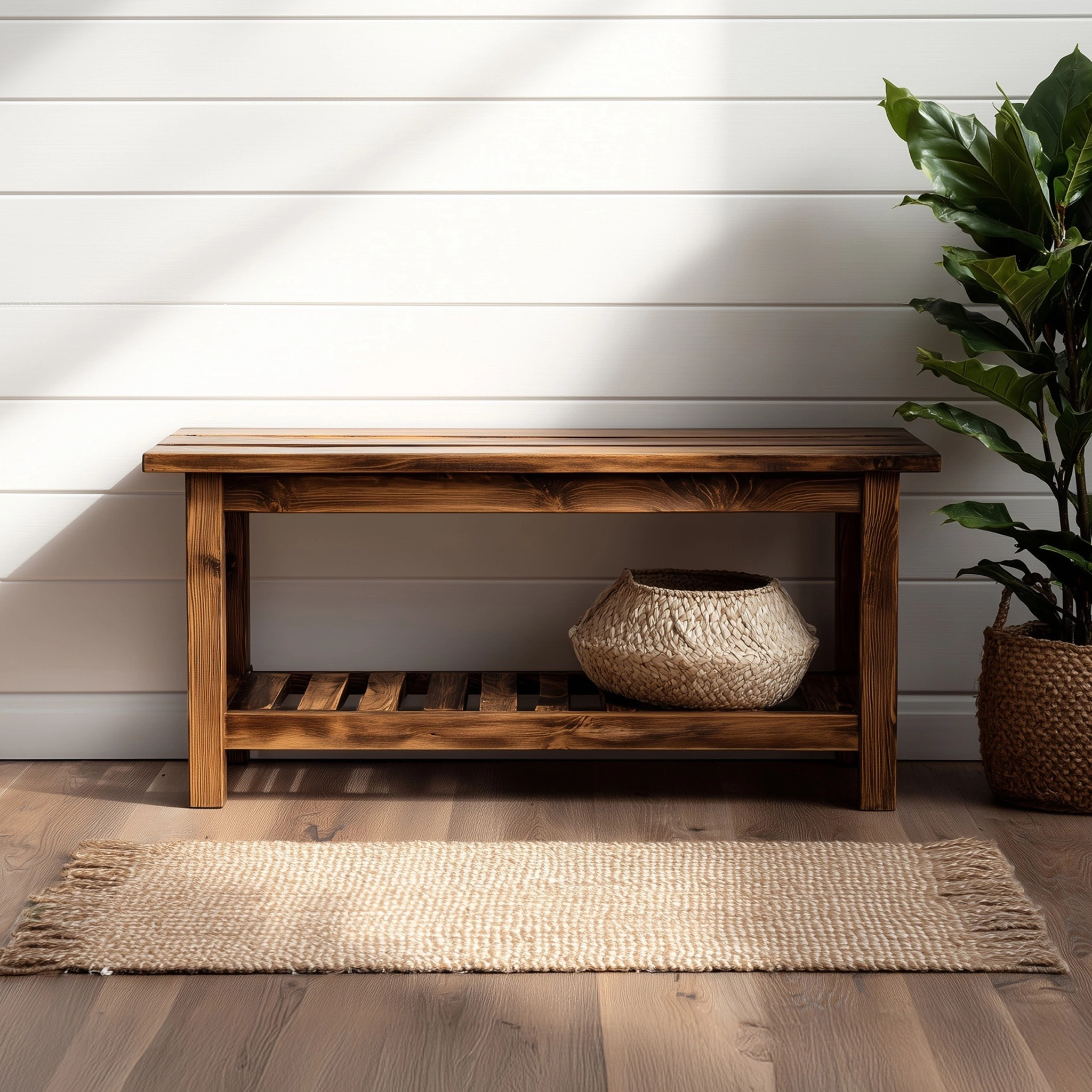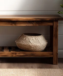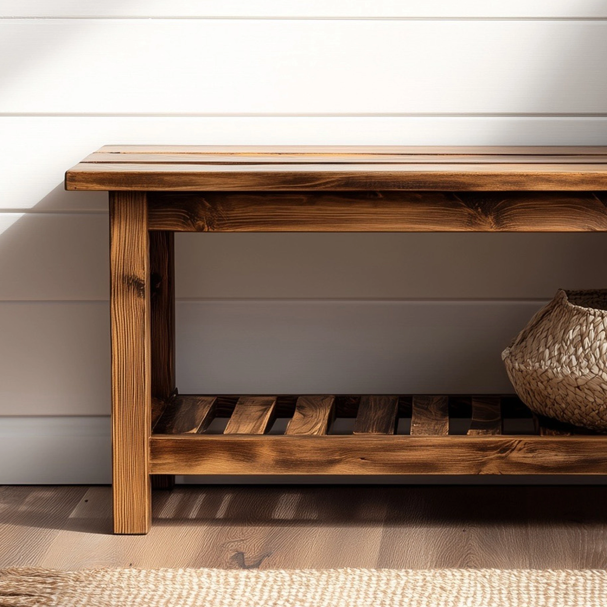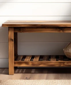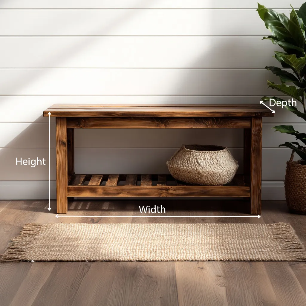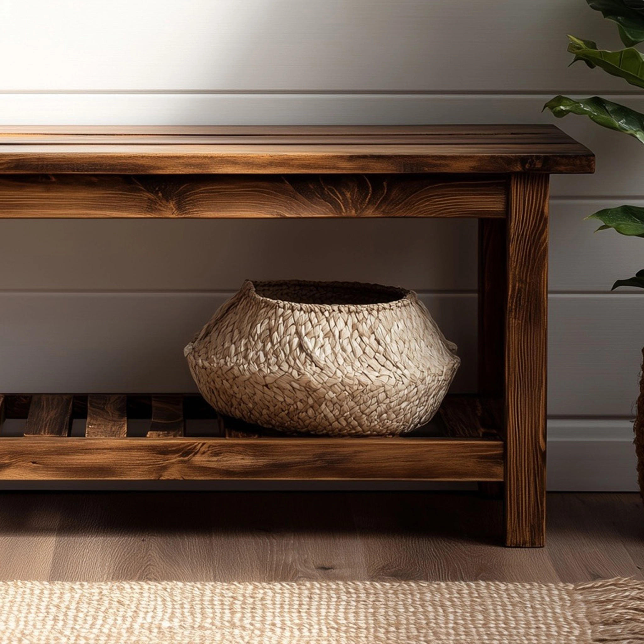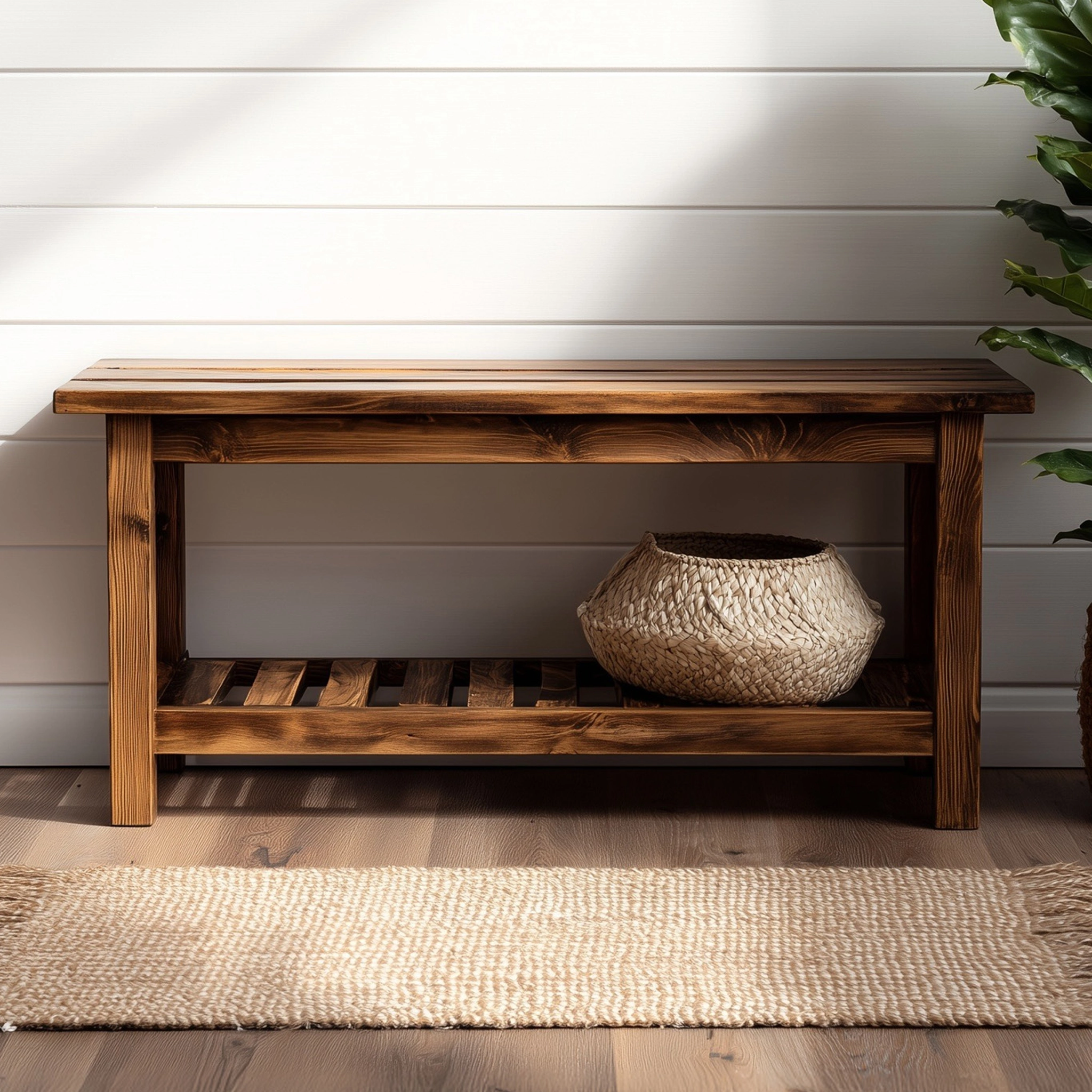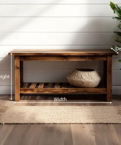 The Simple Wooden Entryway Bench With Lower Storage Shelf is designed to support daily use in entryways, hallways, or mudroom areas. Its straightforward rectangular form provides a stable seating surface while maintaining a clean and balanced appearance.