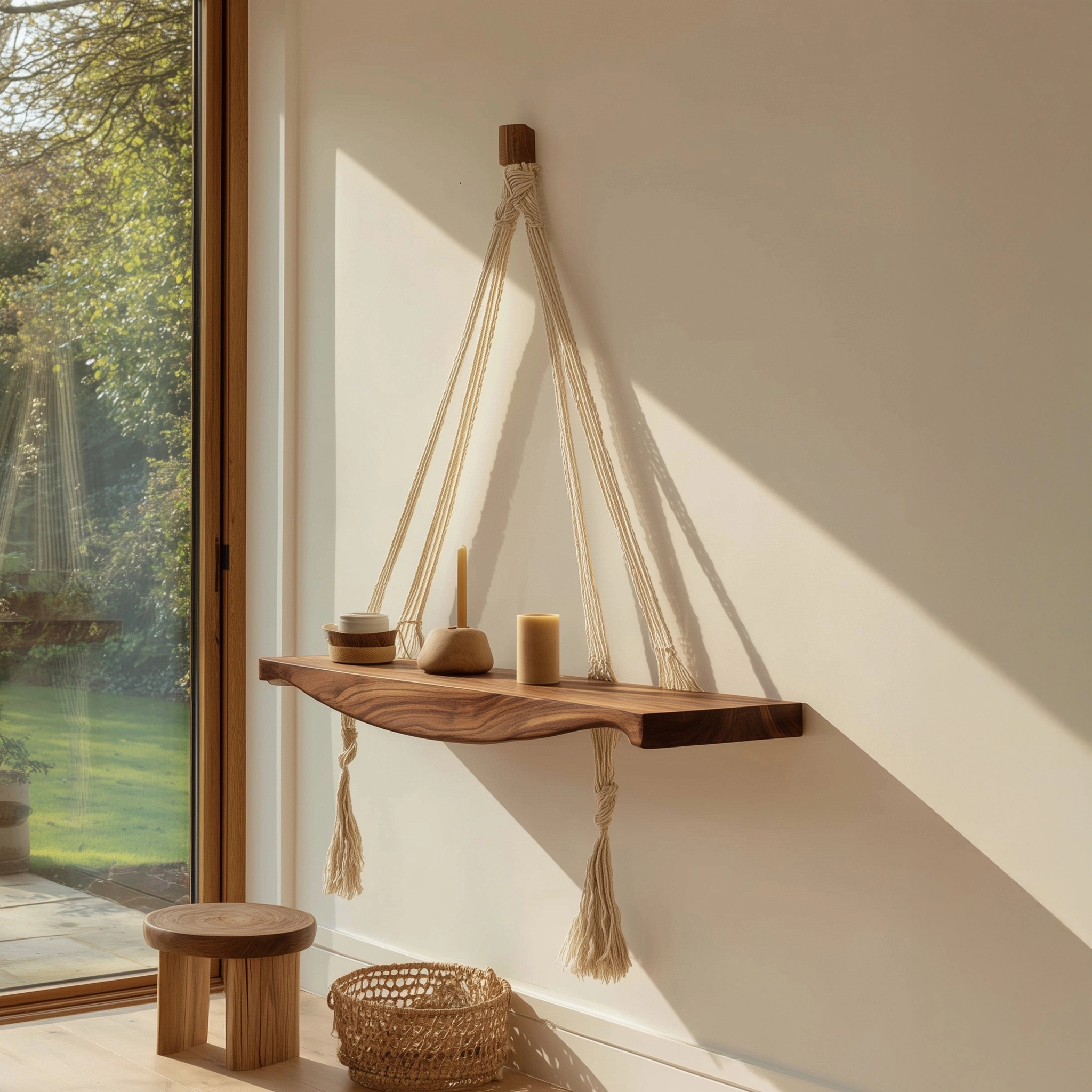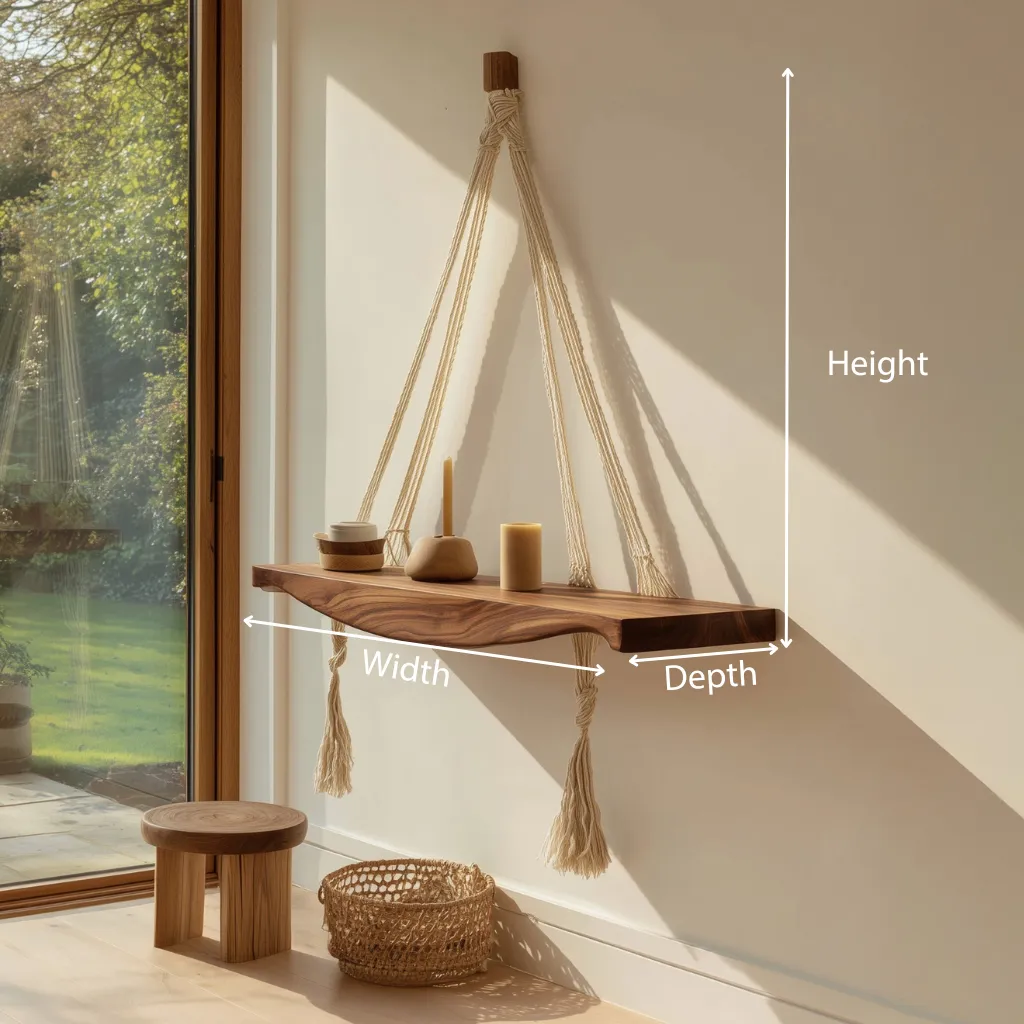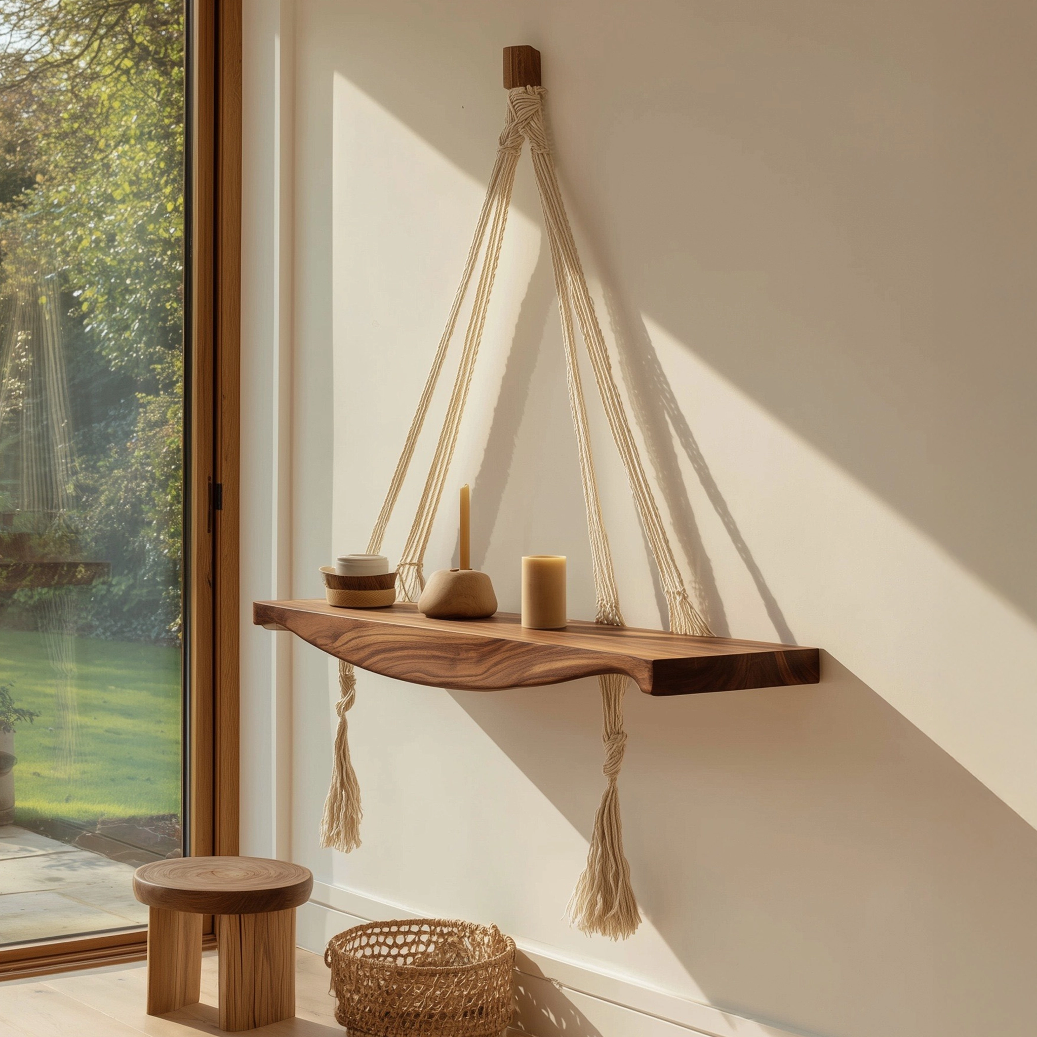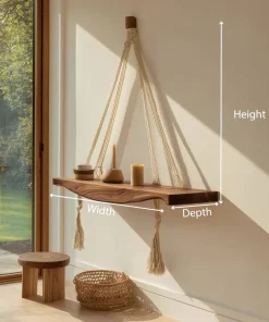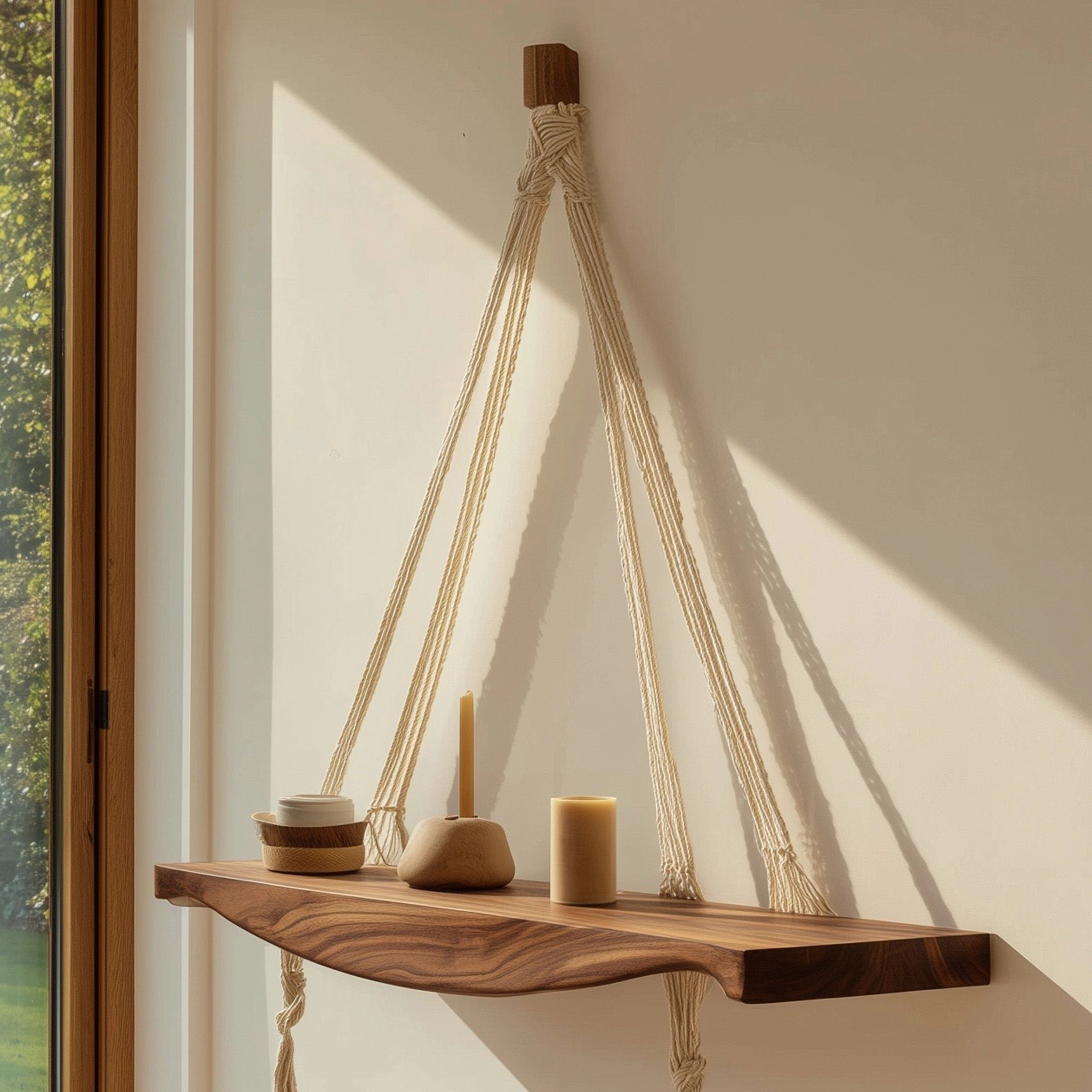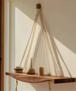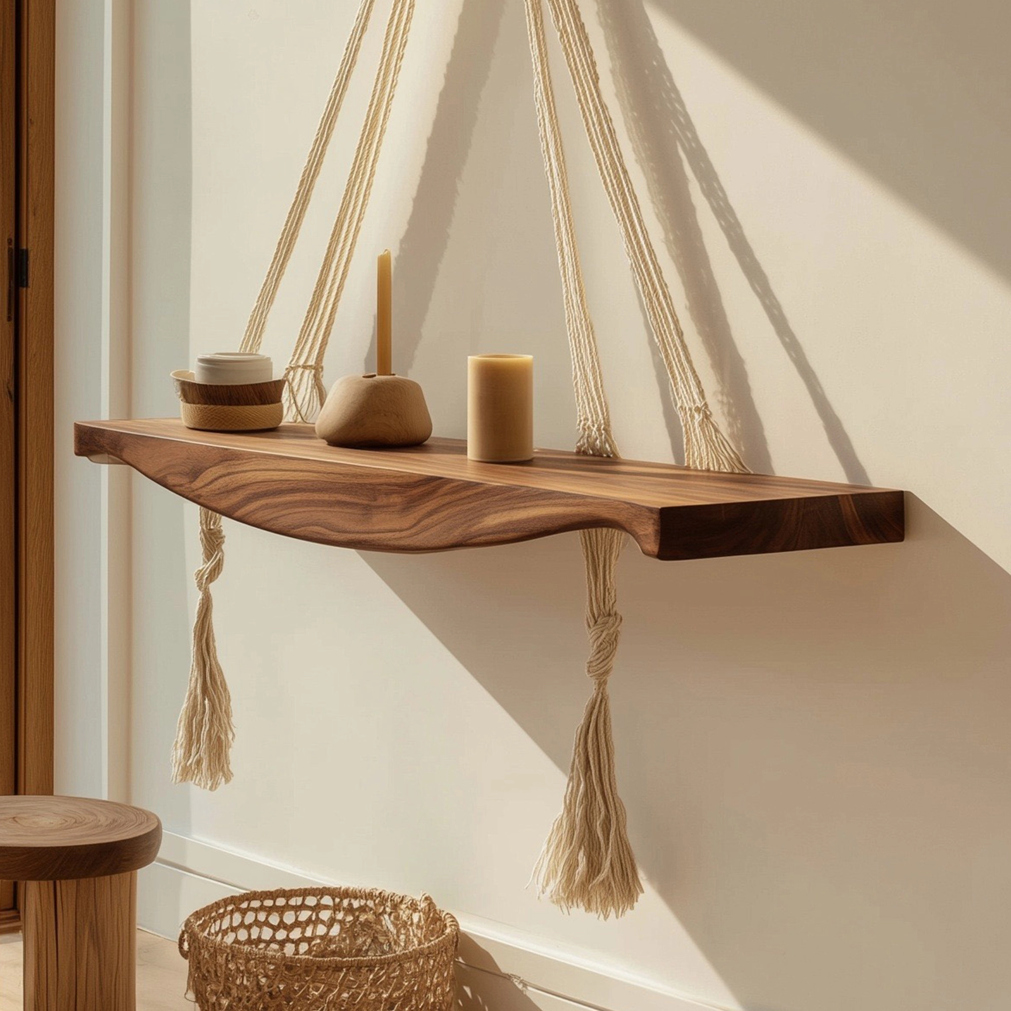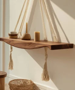 This wooden hanging shelf features a gently contoured solid wood surface supported by braided rope, creating a clean yet expressive wall accent. The natural textures and soft lines give the piece a calm, balanced presence that works well in modern and relaxed interiors.