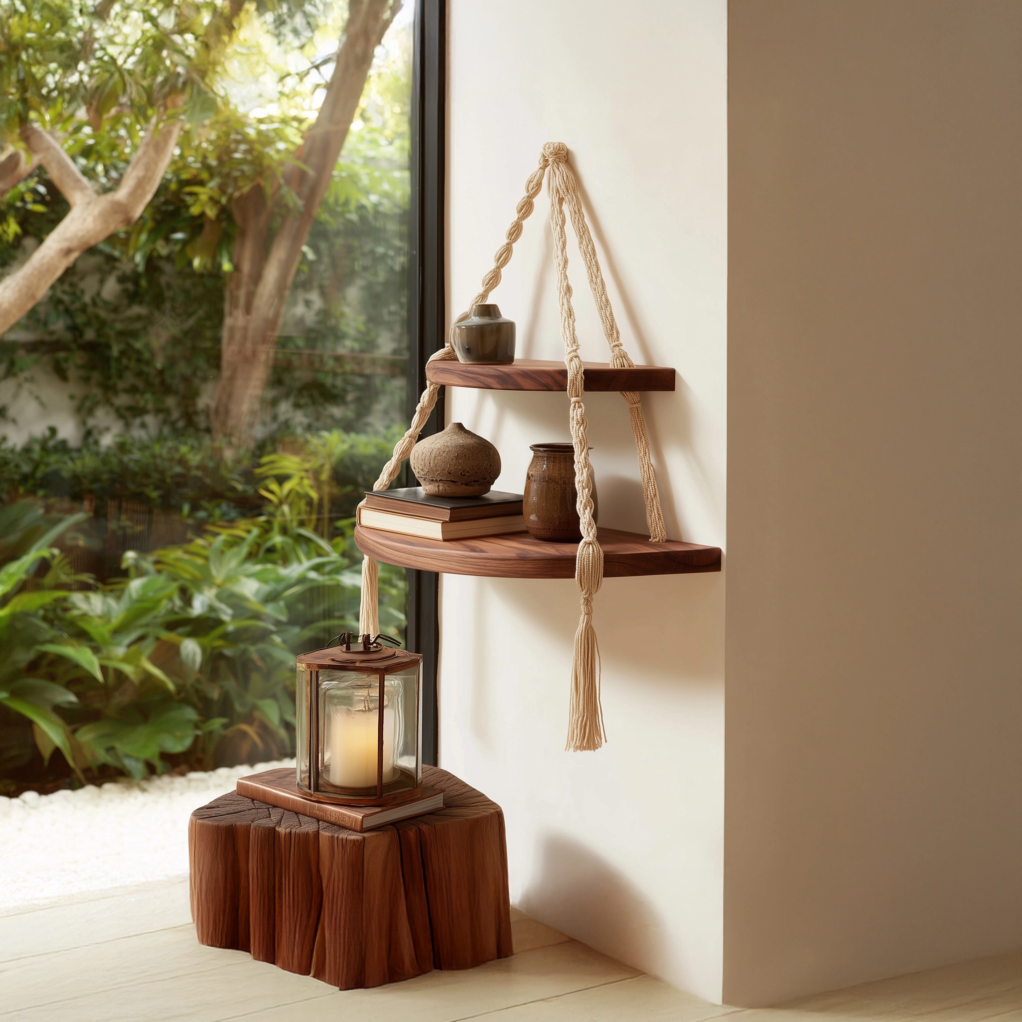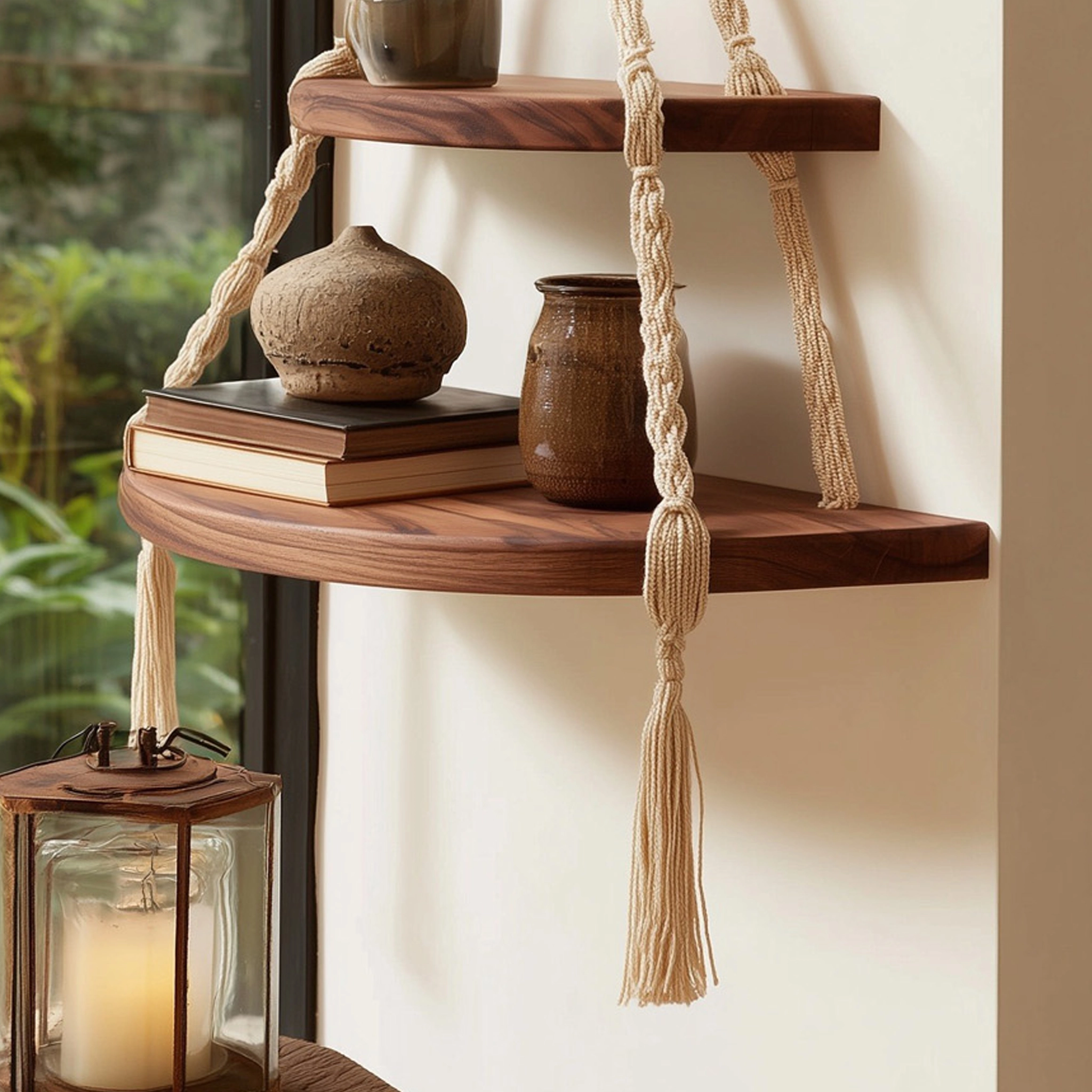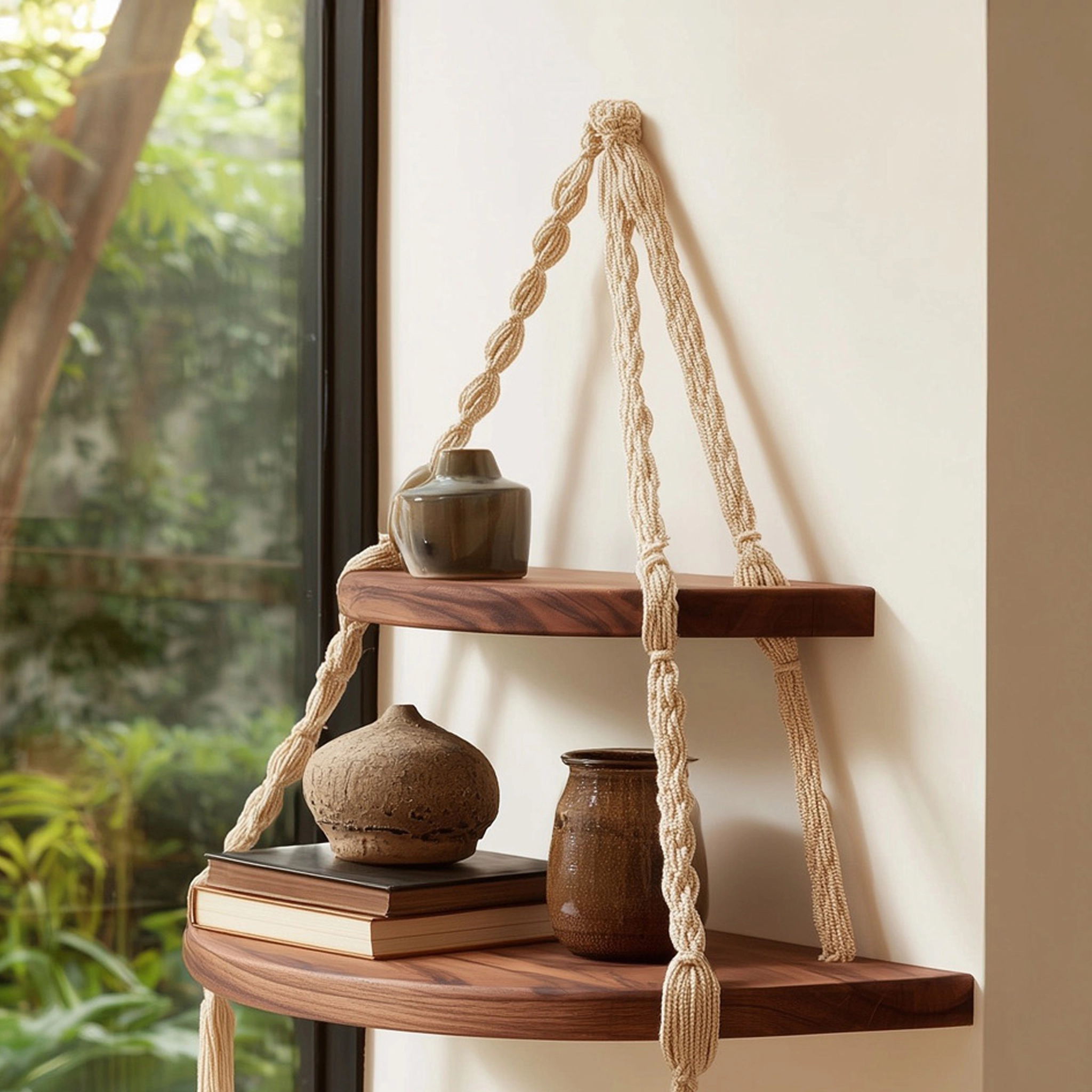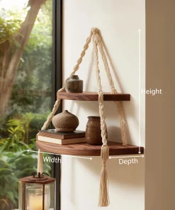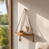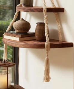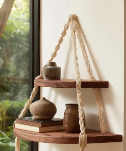 This wooden hanging corner shelf features two rounded tiers suspended by handwoven rope, creating a layered and sculptural wall accent. The warm wood surface contrasts naturally with the textured rope, offering a balanced blend of structure and softness.