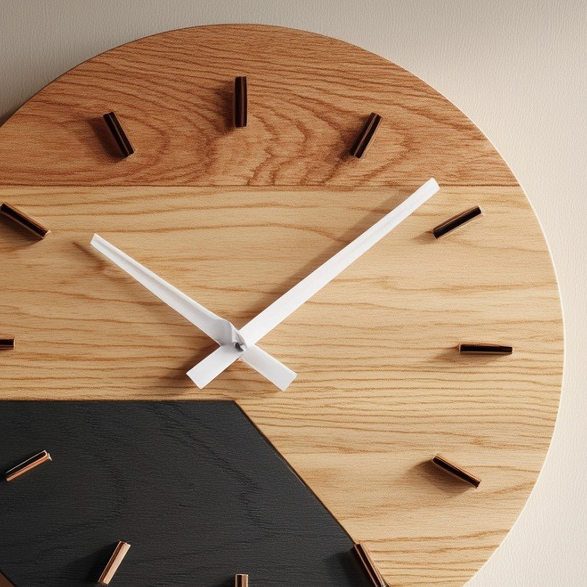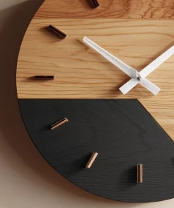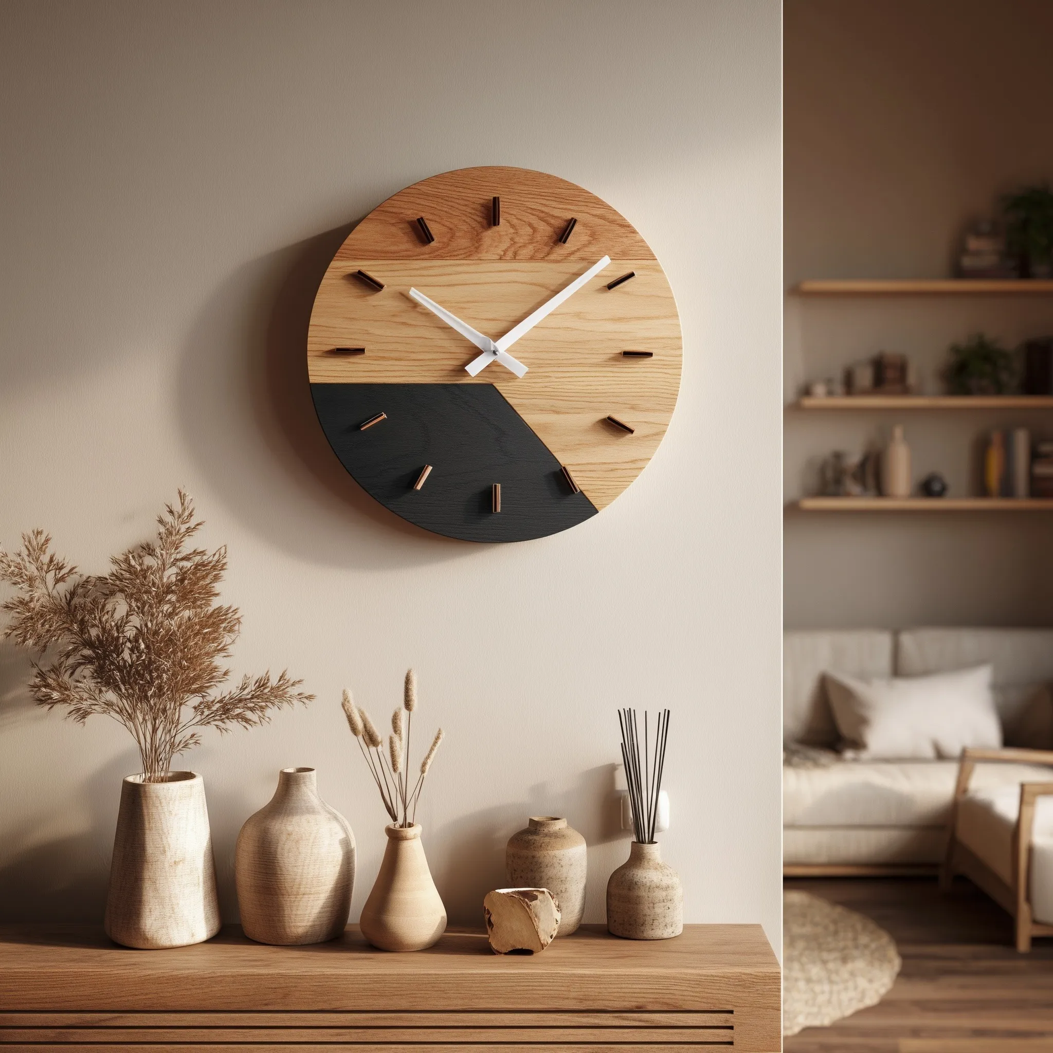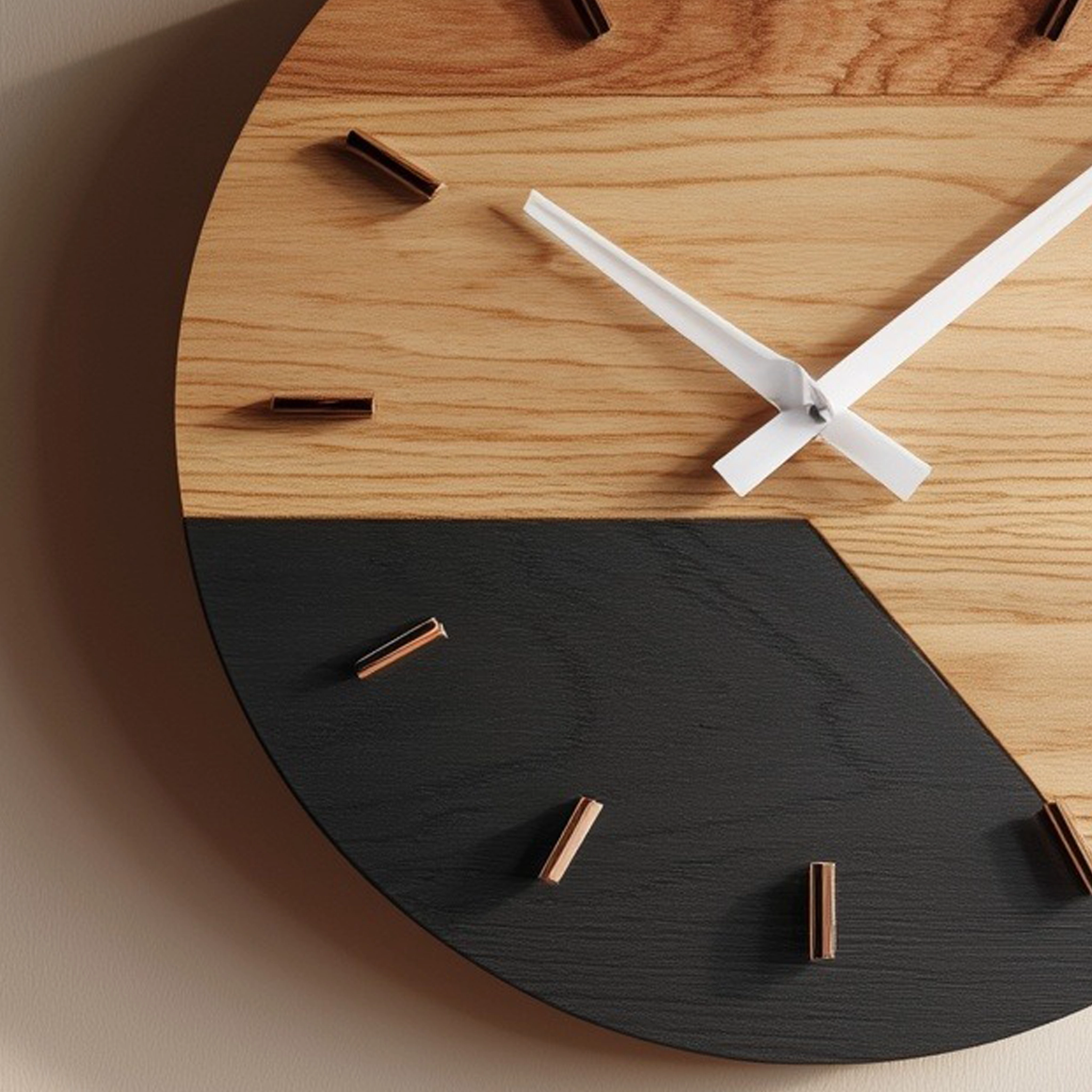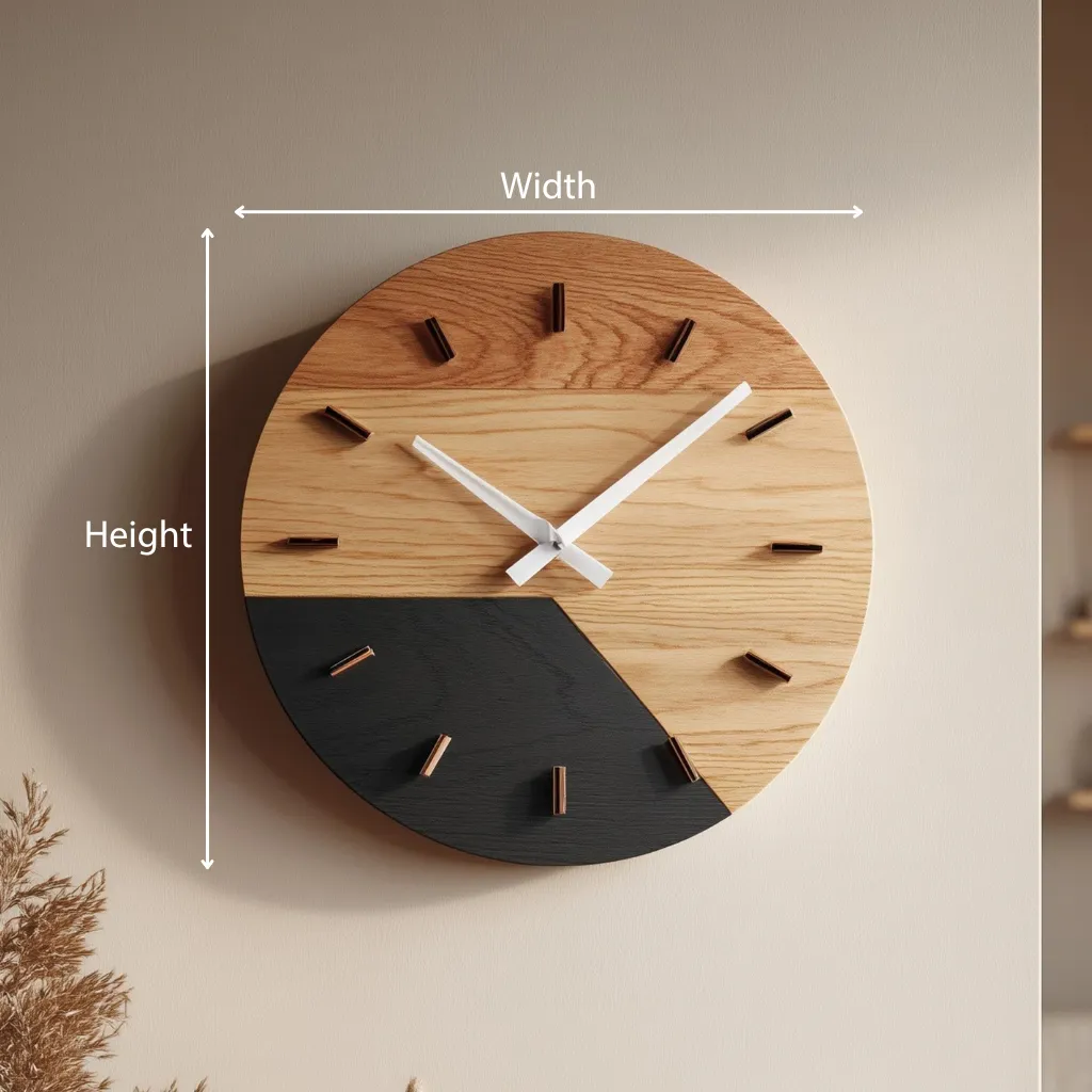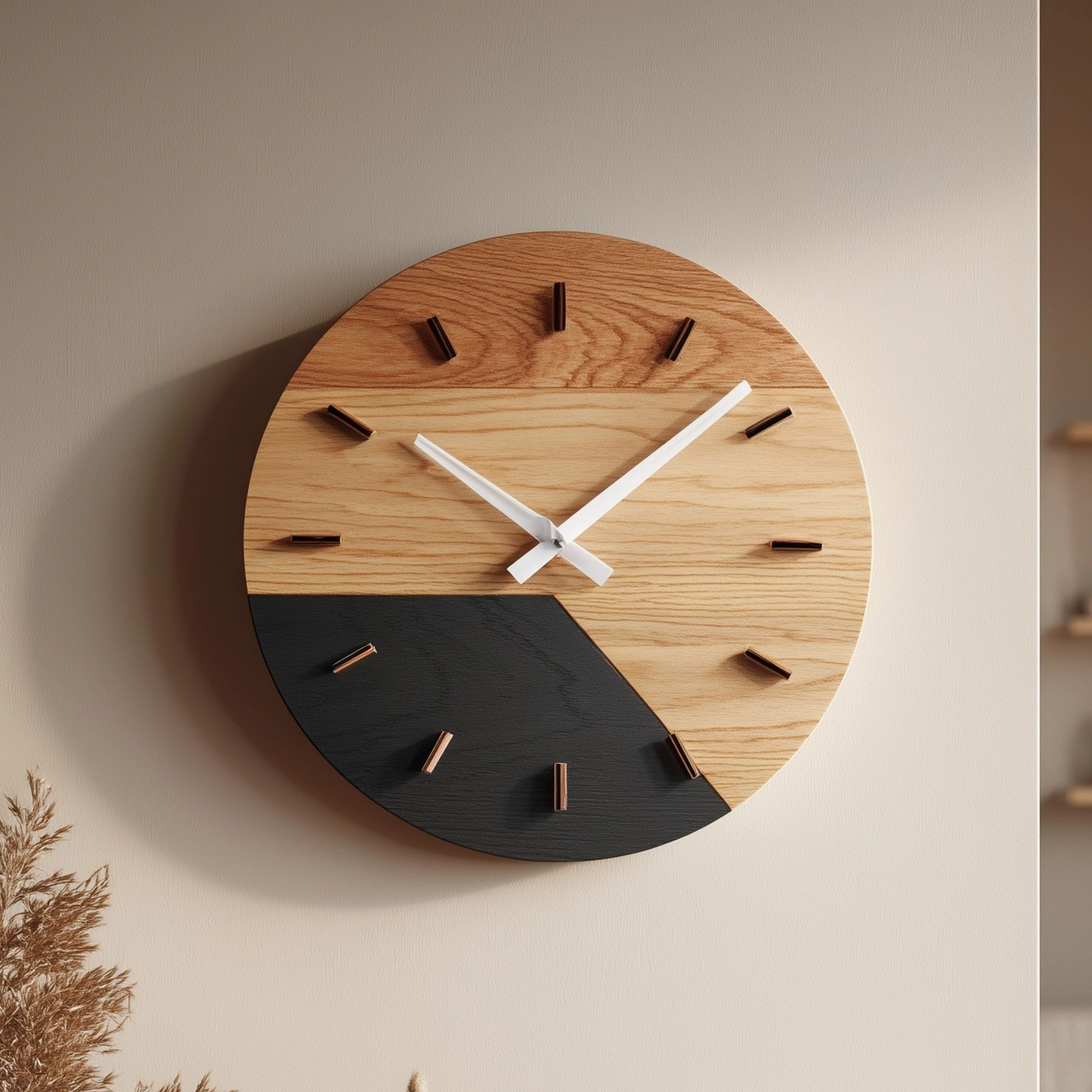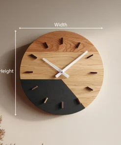 The Two-Tone Circular Wooden Wall Clock combines a natural wood surface with a contrasting darker section, creating a balanced and modern visual composition. Slim hour markers and light-colored hands provide easy readability without overwhelming the overall form.